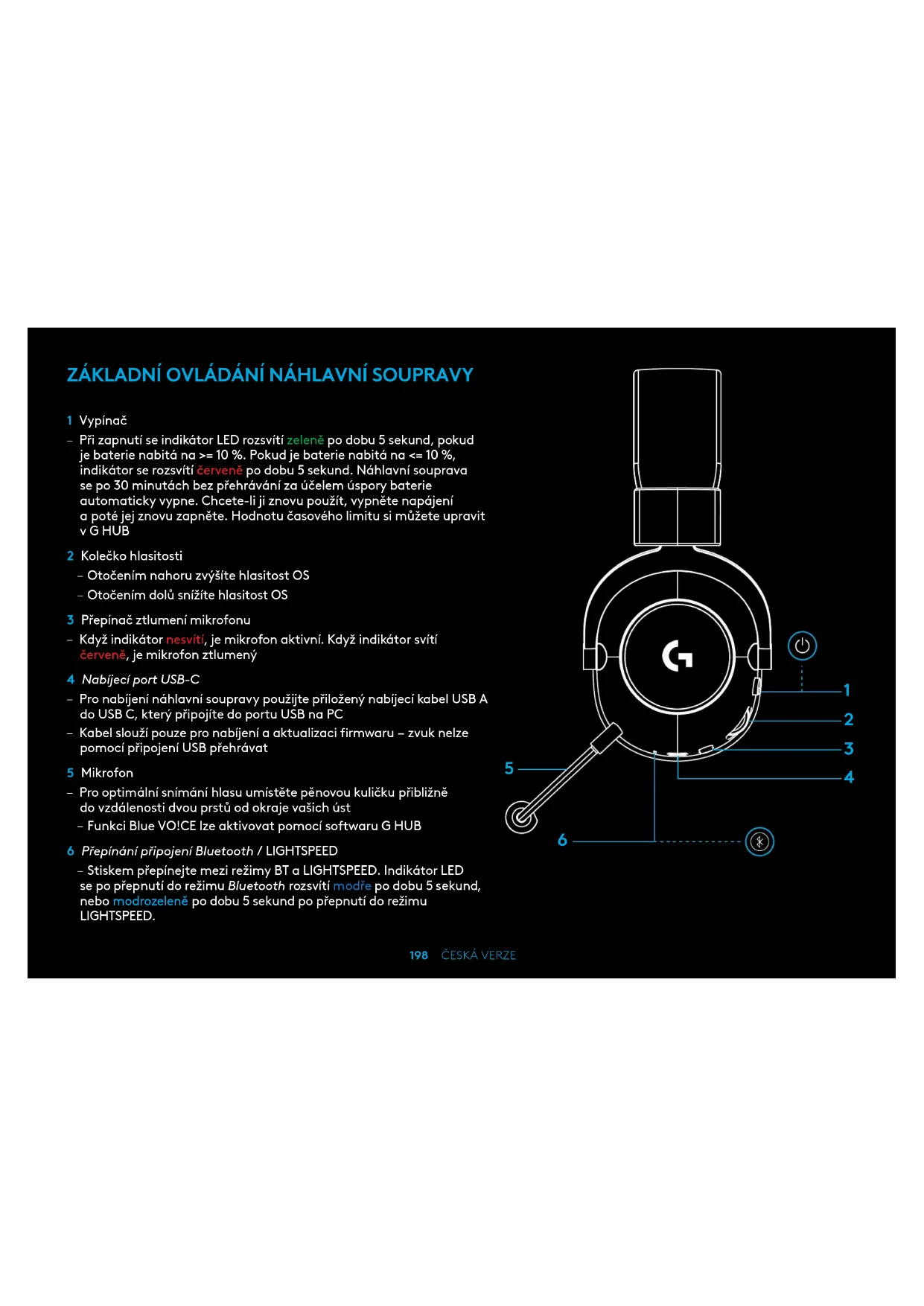 1 A mikrofonos fejhallgatónak LIGHTSPEED módban kelllennie 2 Dugja a kapott 3,5mm-es kábel egyik végétaLIGHTSPEED vezeték nélküli adapter 3,5mm-es portjába197 MAGYAR 3 Dugja a kapott 3,5mm-es kábel másik végét annak ahangforrásnak a 3,5mm-es portjába, amelynek a jelét a vezeték nélküli jelbe szeretné keverni. A kevert forrás állandó hangerőn marad, a vezeték nélküli jel hangereje pedig a hangerő görgetőgombjával állítható. music video pictures social radio podcasts marketplace198 ČESKÁ VERZE ZÁKLADNÍ OVLÁDÁNÍ NÁHLAVNÍ SOUPRAVY 1 Vypínač – Při zapnutí se indikátor LED rozsvítí zeleně po dobu 5 sekund, pokud je baterie nabitá na >=10%. Pokud je baterie nabitá na <=10%, indikátor se rozsvítí červeně po dobu 5 sekund. Náhlavní souprava se po 30 minutách bez přehrávání za účelem úspory baterie automaticky vypne. Chcete-li ji znovu použít, vypněte napájení apoté jej znovu zapněte. Hodnotu časového limitu si můžete upravit vGHUB 2 Kolečko hlasitosti – Otočením nahoru zvýšíte hlasitost OS – Otočením dolů snížíte hlasitost OS 3 Přepínač ztlumení mikrofonu – Když indikátor nesvítí, je mikrofon aktivní. Když indikátor svítí červeně, je mikrofon ztlumený 4 Nabíjecí port USB-C – Pro nabíjení náhlavní soupravy použijte přiložený nabíjecí kabel USB A do USB C, který připojíte do portu USB na PC – Kabel slouží pouze pro nabíjení a aktualizaci rmwaru – zvuk nelze pomocí připojení USB přehrávat 5 Mikrofon – Pro optimální snímání hlasu umístěte pěnovou kuličku přibližně dovzdálenosti dvou prstů od okraje vašich úst – Funkci Blue VO!CE lze aktivovat pomocí sowaru G HUB 6 Přepínání připojení Bluetooth / LIGHTSPEED – Stiskem přepínejte mezi režimy BT a LIGHTSPEED. Indikátor LED sepopřepnutí do režimu Bluetooth rozsvítí modře po dobu 5sekund, nebo modrozeleně po dobu 5 sekund po přepnutí do režimu LIGHTSPEED.