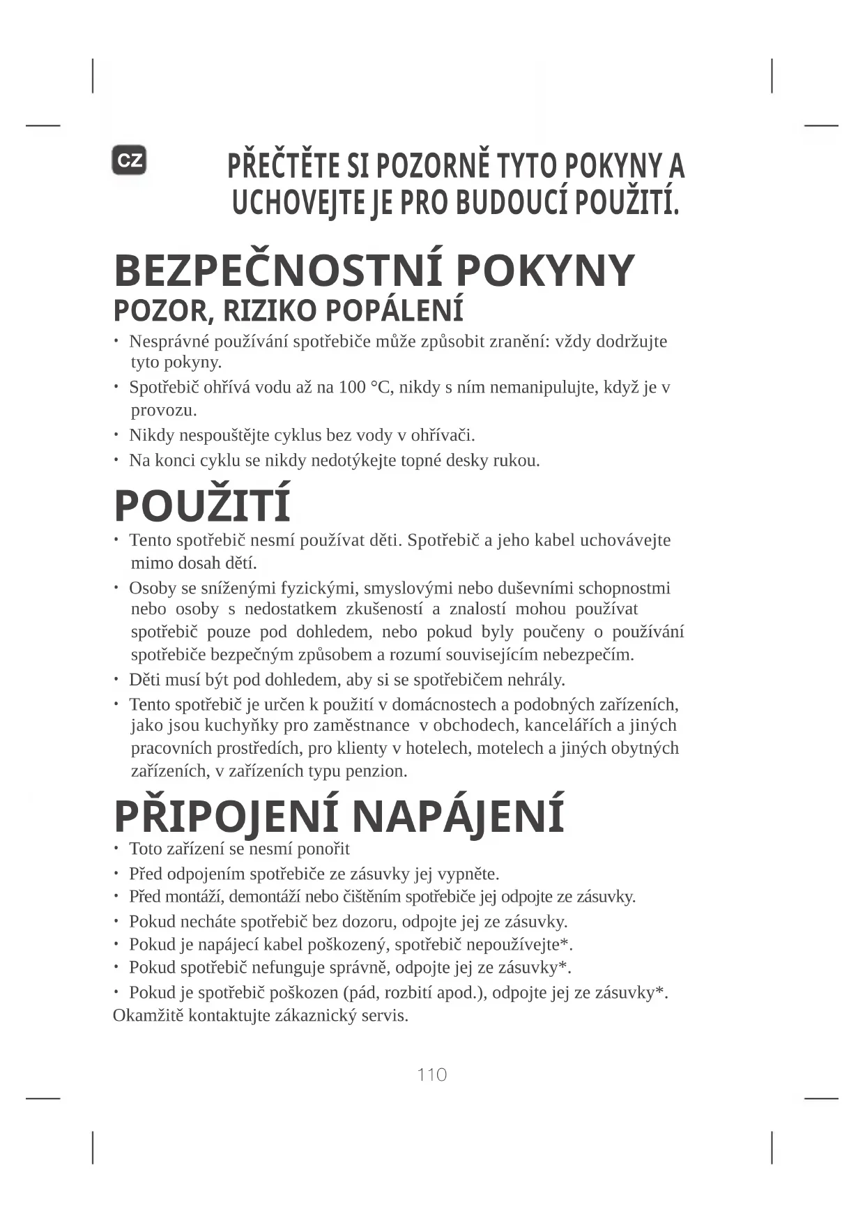 - Pokud je spotřebič poškozen (pád, rozbití apod.), odpojte jej ze zásuvky*. Okamžitě kontaktujte zákaznický servis. PŘEČTĚTE SI POZORNĚ TYTO POKYNY A UCHOVEJTE JE PRO BUDOUCÍ POUŽITÍ. CZ110