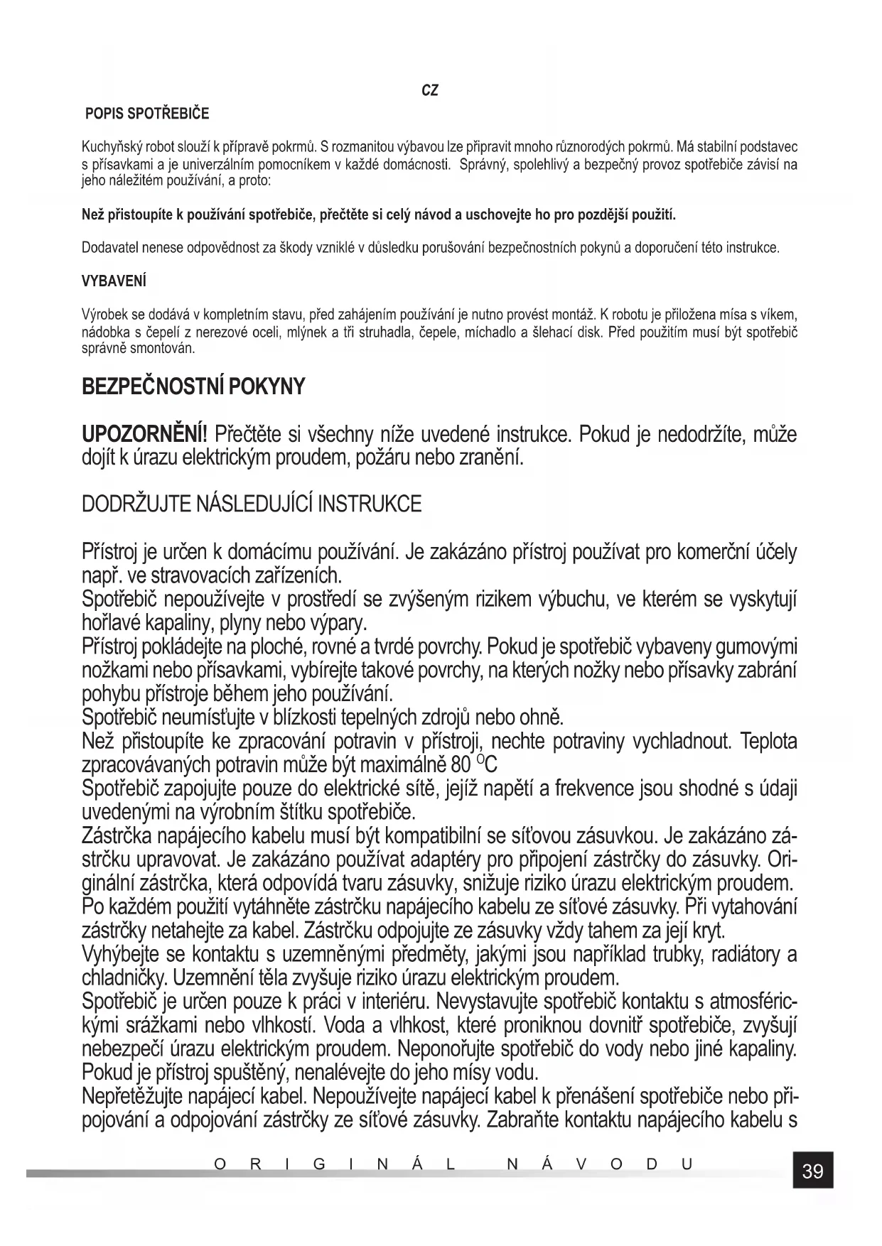 teplem, oleji, ostrými hranami a pohyblivými součástmi. Poškození přívodního kabelu zvyšu- je nebezpečí úrazu elektrickým proudem. V případě poškození napájecího kabelu (například přeříznutí, roztavení izolace) okamžitě vytáhněte zástrčku kabelu ze zásuvky a spotřebič předejte do autorizovaného servisu. Je zakázáno používat spotřebič s poškozeným napá- jecím kabelem. Je zakázáno opravovat napájecí kabel, kabel musí být v autorizovaném servisu vyměněn za nový. Pokud používáte prodlužovací kabely, používejte výhradně tako- vé výrobky, které vyhovují parametrům uvedeným na výrobním štítku spotřebiče. Průřez žil prodlužovacího kabelu nesmí být menší než průřez žil napájecího kabelu spotřebiče. Tyto údaje zkontroluje na izolaci napájecího kabelu a prodlužovacího kabelu nebo se obraťte na výrobce spotřebiče nebo prodlužovacího kabelu. Je zakázáno používat spotřebič s poškozeným vybavením. V případě zjištění poškození ja- kékoli části spotřebiče nebo jeho příslušenství je jeho další používání zakázáno. V takovém případě přístroj odevzdejte do autorizovaného servisu nebo samostatně vyměňte poškoze- nou část, pokud je v návodu k použití taková vým ěna uvedená jako povolená. Před zahájením jakýchkoli činností spojených s výměnou, čištěním nebo regulací pohybli- vých částí přístroj vypněte a zástrčku napájecího kabelu vytáhněte ze síťové zásuvky. Děti nesmějí spotřebič používat. Tento spotřebič může být používán osobami s fyzickým nebo mentálním omezením anebo bez praktických zkušeností a vědomostí, pokud to bude probíhat pod dozorem anebo bude zajištěna instruktáž o použití spotřebiče bezpečným způ- sobem tak, aby rizika s ním spojená byla pochopena. Spotřebič držte mimo dosah dětí, není určen ke hře. Děti bez dozoru nesmí provádět čištění ani údržbu přístroje. Součástí spotřebiče jsou ostré díly (čepele mixéru, čepele mlýnku, sekací nože, ostří struha- del). Při montáži, demontáži a čištění těchto dílů je nutné dbát zvýšené opatrnosti. Spotřebič je určen pouze pro domácí použití. Doporučená doba nepřetržitého provozu činí 6 minut, poté je nutné ponechat přístroj asi 20 minut vychladnout. Na tuto dobu odpojte zástr- čku napájecího kabelu z elektrické zásuvky.