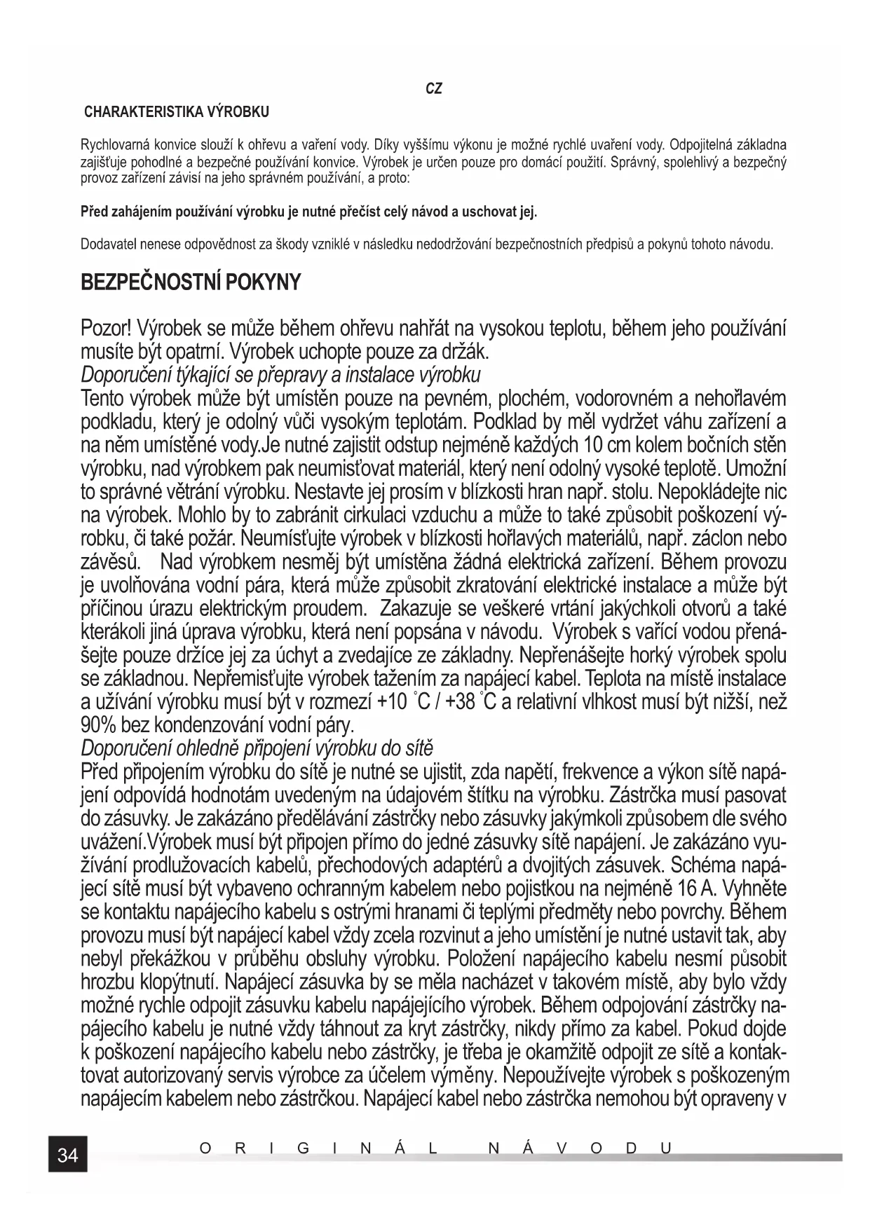 Rychlovarná konvice slouží k ohřevu a vaření vody. Díky vyššímu výkonu je možné rychlé uvaření vody. Odpojitelná základna zajišťuje pohodlné a bezpečné používání konvice. Výrobek je určen pouze pro domácí použití. Správný, spolehlivý a bezpečný provoz zařízení závisí na jeho správném používání, a proto: Před zahájením používání výrobku je nutné přečíst celý návod a uschovat jej. Dodavatel nenese odpovědnost za škody vzniklé v následku nedodržování bezpečnostních předpisů a pokynů tohoto návodu.