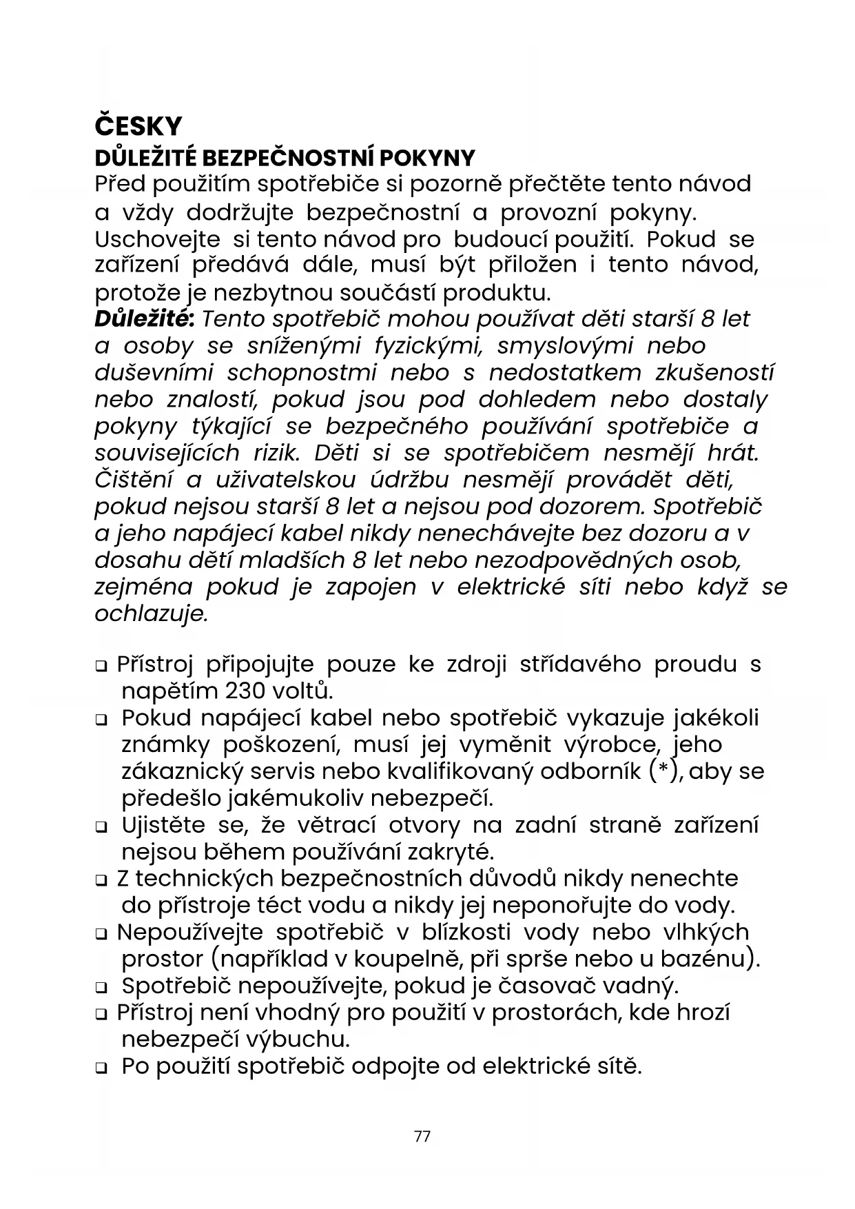 Před použitím spotřebiče si pozorně přečtěte tento návod a vždy dodržujte bezpečnostní a provozní pokyny. Uschovejte si tento návod pro budoucí použití. Pokud se zařízení předává dále, musí být přiložen i tento návod, protože je nezbytnou součástí produktu. Důležité: Tento spotřebič mohou používat děti starší 8 let a osoby se sníženými fyzickými, smyslovými nebo duševními schopnostmi nebo s nedostatkem zkušeností nebo znalostí, pokud jsou pod dohledem nebo dostaly pokyny týkající se bezpečného používání spotřebiče a souvisejících rizik. Děti si se spotřebičem nesmějí hrát. Čištění a uživatelskou údržbu nesmějí provádět děti, pokud nejsou starší 8 let a nejsou pod dozorem. Spotřebič a jeho napájecí kabel nikdy nenechávejte bez dozoru a v dosahu dětí mladších 8 let nebo nezodpovědných osob, zejména pokud je zapojen v elektrické síti nebo když se ochlazuje. ❑ Přístroj připojujte pouze ke zdroji střídavého proudu s napětím 230 voltů. ❑ Pokud napájecí kabel nebo spotřebič vykazuje jakékoli známky poškození, musí jej vyměnit výrobce, jeho zákaznický servis nebo kvalifikovaný odborník (*), aby se předešlo jakémukoliv nebezpečí. ❑ Ujistěte se, že větrací otvory na zadní straně zařízení nejsou během používání zakryté. ❑ Z technických bezpečnostních důvodů nikdy nenechte do přístroje téct vodu a nikdy jej neponořujte do vody. ❑ Nepoužívejte spotřebič v blízkosti vody nebo vlhkých prostor (například v koupelně, při sprše nebo u bazénu). ❑ Spotřebič nepoužívejte, pokud je časovač vadný. ❑ Přístroj není vhodný pro použití v prostorách, kde hrozí nebezpečí výbuchu. ❑ Po použití spotřebič odpojte od elektrické sítě.78