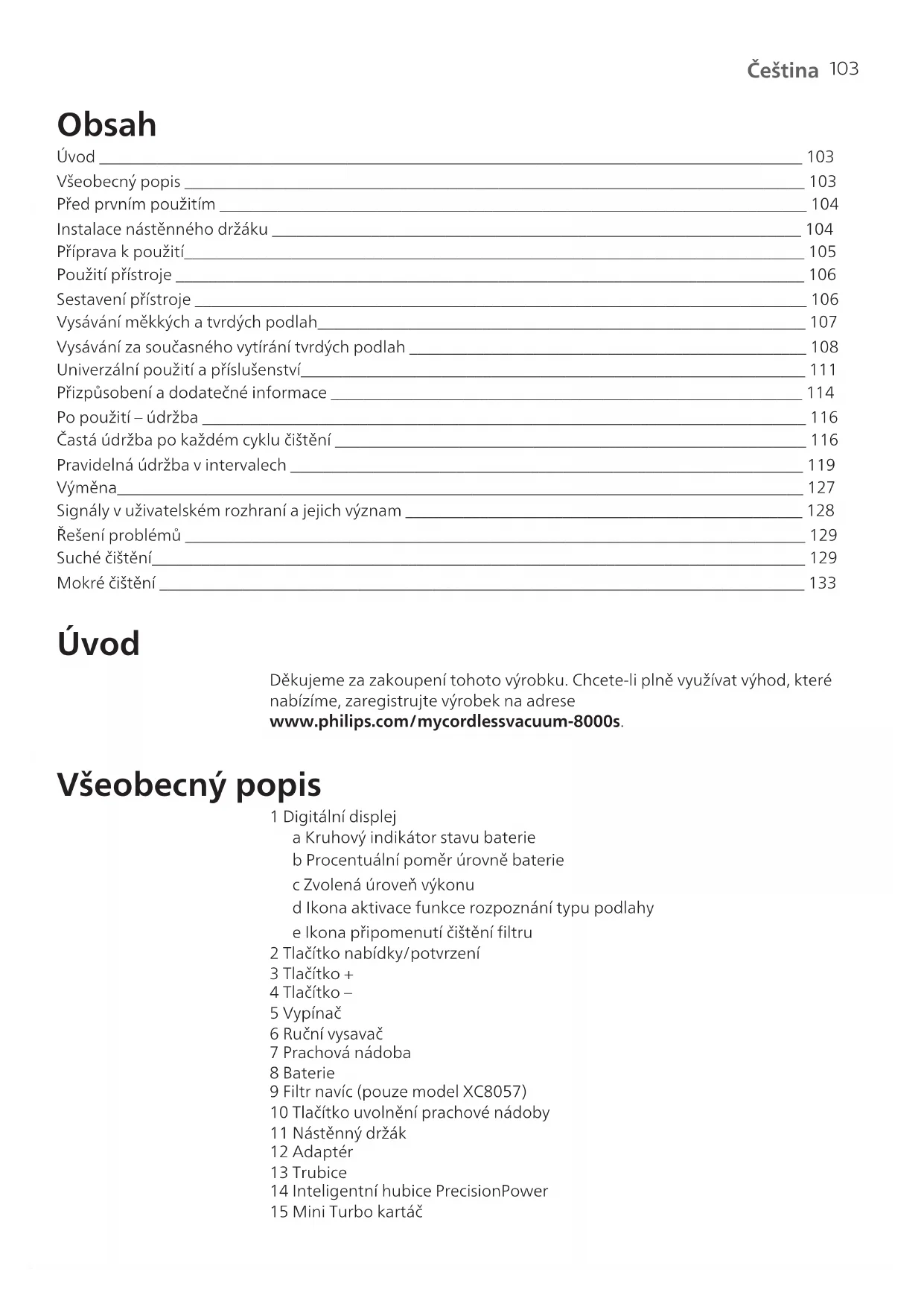 Čeština Obsah Úvod _____________________________________________________________________________________ 103 Všeobecný popis ___________________________________________________________________________ 103 Před prvním použitím _______________________________________________________________________ 104 Instalace nástěnného držáku ________________________________________________________________ 104 Příprava kpoužití___________________________________________________________________________ 105 Použití přístroje ____________________________________________________________________________ 106 Sestavení přístroje __________________________________________________________________________ 106 Vysávání měkkých atvrdých podlah___________________________________________________________ 107 Vysávání za současného vytírání tvrdých podlah ________________________________________________ 108 Univerzální použití apříslušenství_____________________________________________________________ 111 Přizpůsobení adodatečné informace _________________________________________________________ 114 Po použití– údržba _________________________________________________________________________ 116 Častá údržba po každém cyklu čištění _________________________________________________________ 116 Pravidelná údržba vintervalech ______________________________________________________________ 119 Výměna___________________________________________________________________________________ 127 Signály vuživatelském rozhraní a jejich význam ________________________________________________ 128 Řešení problémů ___________________________________________________________________________ 129 Suché čištění_______________________________________________________________________________ 129 Mokré čištění ______________________________________________________________________________ 133 Úvod Děkujeme za zakoupení tohoto výrobku. Chcete-li plně využívat výhod, které nabízíme, zaregistrujte výrobek na adrese www.philips.com/mycordlessvacuum-8000s. Všeobecný popis 1 Digitální displej a Kruhový indikátor stavu baterie b Procentuální poměr úrovně baterie c Zvolená úroveň výkonu d Ikona aktivace funkce rozpoznání typu podlahy e Ikona připomenutí čištění filtru 2 Tlačítko nabídky/potvrzení 3 Tlačítko + 4 Tlačítko– 5 Vypínač 6 Ruční vysavač 7 Prachová nádoba 8 Baterie 9 Filtr navíc (pouze model XC8057) 10 Tlačítko uvolnění prachové nádoby 11 Nástěnný držák 12 Adaptér 13 Trubice 14 Inteligentní hubice PrecisionPower 15 Mini Turbo kartáč104 Čeština 16 Kombinovaný nástavec 17 Jemný kartáček 18 Nástavec na čalounění 19 Nástavec pro štěrbiny 20 Vysávání aaktivní vytírání 21 Nádržka na vodu 22 Mopovací polštářek zmikrovláken Před prvním použitím Instalace nástěnného držáku 1 Nástěnný držák obraťte aodjistěte šedou páku. Vložte nabíjecí port. Zkontrolujte, že kovová část je vidět aukazuje nahoru na přední stranu nástěnného držáku. 2 Lehkým zatlačením úhledně poskládejte kabel do určené drážky. 3 Zavřete šedou páku. Podle slyšitelného cvaknutí se ujistěte, že je šedá páka na svém místě. 110 ± 2 cm 4 Pevně připevněte nástěnný držák do zvolené pozice na stěně. Montážní otvory pro šrouby by měly být přibližně 110cm nad zemí. Upozornění: Při vrtání otvorů do stěny může dojít kúrazu elektrickým proudem, buďte proto opatrní.105 Čeština Poznámka: Zkontrolujte, že umístění nástěnného držáku je zvoleno tak, že může celý přístroj viset na stěně, aniž by se hubicí dotýkal podlahy. 5 Jakmile určíte optimální umístění avýšku pro skladování anabíjení přístroje, pevně šrouby utáhněte, aby byl nástěnný držák řádně upevněn. Příprava kpoužití Přístroj je vybaven baterií Li-Ion. Nabíjení vybité baterie na plné nabití trvá asi 6hodin. 1 Připojte akumulátor do těla přístroje. Podle slyšitelného cvaknutí se ujistěte, že je řádně připojen. MAX 40⁰C MIN 5⁰C 2 Přístroj nabíjejte tak, že jej umístíte do namontovaného nástěnného držáku. Varování: Přístroj uschovávejte anabíjejte při teplotě vrozmezí 5°C až 40°C.106 Čeština Poznámka: Také můžete položit ruční vysavač na rovný astabilní povrch azapojit nabíjecí kabel přímo do přístroje.