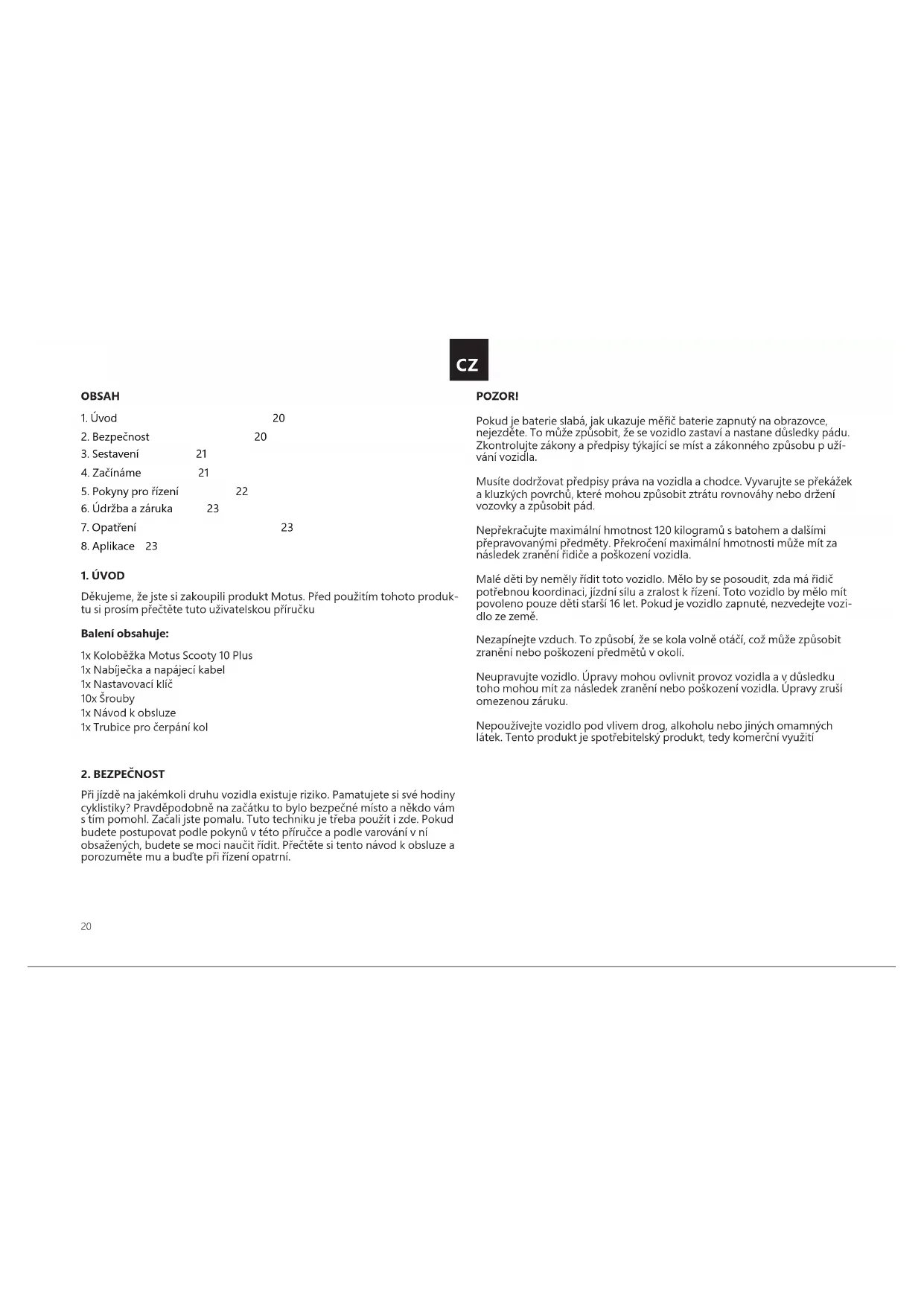 Děkujeme, že jste si zakoupili produkt Motus. Před použitím tohoto produk- tu si prosím přečtěte tuto uživatelskou příručku Balení obsahuje: 1x Koloběžka Motus Scooty 10 Plus 1x Nabíječka a napájecí kabel 1x Nastavovací klíč 10x Šrouby 1x Návod k obsluze 1x Trubice pro čerpání kol