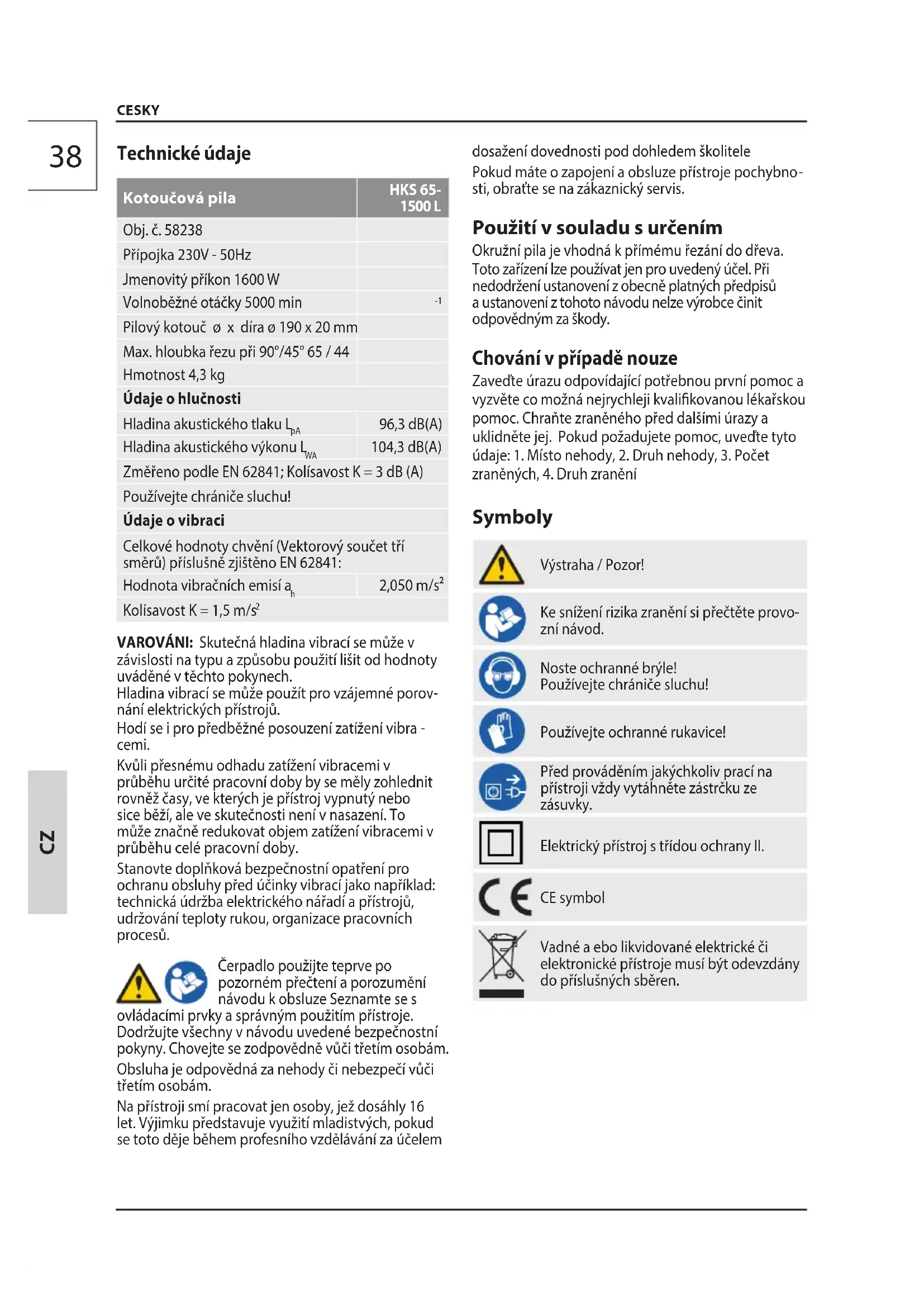 CESKY Technické údaje Kotoučová pila HKS 65- 1500 L Obj. č. 58238 Přípojka 230V - 50Hz Jmenovitý příkon 1600 W Volnoběžné otáčky 5000 min