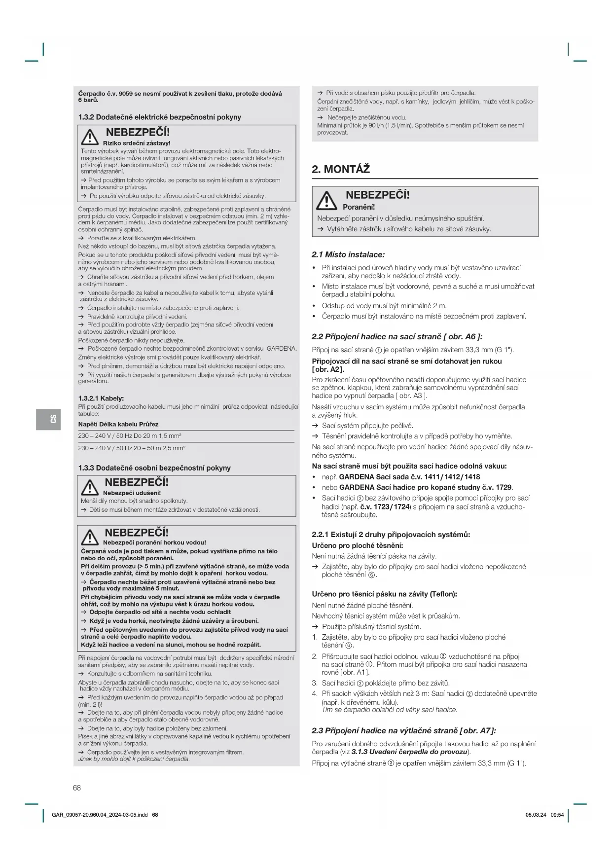 Čerpadlo č.v. 9059 se nesmí používat k zesílení tlaku, protože dodává 6barů.1.3.2 Dodatečné elektrické bezpečnostní pokyny NEBEZPEČÍ! Riziko srdeční zástavy!Tento výrobek vytváří během provozu elektromagnetické pole. Toto elektro-magnetické pole může ovlivnit fungování aktivních nebo pasivních lékařských přístrojů (např. kardiostimulátorů), což může mít za následek vážná nebo smrtelná zranění. v Před použitím tohoto výrobku se poraďte se svým lékařem asvýrobcem implantovaného přístroje.v Po použití výrobku odpojte síťovou zástrčku od elektrické zásuvky.Čerpadlo musí být instalováno stabilně, zabezpečené proti zaplavení a chráněné proti pádu do vody. Čerpadlo instalovat v bezpečném odstupu (min. 2m) vzhle-dem k čerpanému médiu. Jako dodatečné zabezpečení lze použít certifikovaný osobní ochranný spínač.v Poraďte se s kvalifikovaným elektrikářem.Než někdo vstoupí do bazénu, musí být síťová zástrčka čerpadla vytažena.Pokud se u tohoto produktu poškodí síťové přívodní vedení, musí být vymě-něnovýrobcem nebo jeho servisem nebo podobně kvalifikovanou osobou, aby se vyloučilo ohrožení elektrickým proudem.v Chraňte síťovou zástrčku a přívodní síťové vedení před horkem, olejem a ostrými hranami.v Nenoste čerpadlo za kabel a nepoužívejte kabel k tomu, abyste vytáhli zástrčku zelektrické zásuvky.v Čerpadlo instalujte na místo zabezpečené proti zaplavení.v Pravidelně kontrolujte přívodní vedení.v Před použitím podrobte vždy čerpadlo (zejména síťové přívodní vedení a síťovou zástrčku) vizuální prohlídce.Poškozené čerpadlo nikdy nepoužívejte.v Poškozené čerpadlo nechte bezpodmínečně zkontrolovat v servisu GARDENA.Změny elektrické výstroje smí provádět pouze kvalifikovaný elektrikář.v Před plněním, demontáží a údržbou musí být elektrické napájení odpojeno.v Při využití našich čerpadel s generátorem dbejte výstražných pokynů výrobce generátoru.1.3.2.1 Kabely:Při použití prodlužovacího kabelu musí jeho minimální průřez odpovídat následující tabulce:Napětí Délka kabelu Průřez230 – 240 V / 50 Hz Do 20 m 1,5 mm²230 – 240 V / 50 Hz 20 – 50 m 2,5 mm²1.3.3 Dodatečné osobní bezpečnostní pokyny NEBEZPEČÍ!Nebezpečí udušení!Menší díly mohou být snadno spolknuty. v Děti se musí během montáže zdržovat v dostatečné vzdálenosti. NEBEZPEČÍ!Nebezpečí poranění horkou vodou!Čerpaná voda je pod tlakem a může, pokud vystříkne přímo na tělo nebo do očí, způsobit poranění.Při delším provozu (> 5 min.) při zavřené výtlačné straně, se může voda včerpadle zahřát, čímž by mohlo dojít k opaření horkou vodou.v Čerpadlo nechte běžet proti uzavřené výtlačné straně nebo bez přívodu vody maximálně 5 minut.Při chybějícím přívodu vody na sací straně se může voda v čerpadle ohřát, což by mohlo na výstupu vést k úrazu horkou vodou.v Odpojte čerpadlo od sítě a nechte vodu ochladit v Když je voda horká, neotvírejte žádné uzávěry a šroubení.v Před opětovným uvedením do provozu zajistěte přívod vody na sací straně a celé čerpadlo naplňte vodou.Když leží hadice a vedení na slunci, mohou se hodně rozpálit.Při napojení čerpadla na vodovodní potrubí musí být dodrženy specifické národní sanitární předpisy, aby se zabránilo zpětnému nasátí nepitné vody.v Konzultujte s odborníkem na sanitární techniku.Abyste u čerpadla zabránili chodu nasucho, dbejte na to, aby se konec sací hadice vždy nacházel v čerpaném médiu.v Před každým uvedením do provozu naplňte čerpadlo vodou až po přepad (min. 2 l)!v Dbejte na to, aby při plnění čerpadla vodou nebyly připojeny žádné hadice aspotřebiče a aby čerpadlo stálo obecně vodorovně.v Dbejte na to, aby byly hadice položeny bez zalomení.Písek a jiné abrazivní látky v dopravované kapalině vedou k rychlému opotřebení a snížení výkonu čerpadla.v Čerpadlo používejte jen s vestavěným integrovaným filtrem. Jinak by mohlo dojít k poškození čerpadla.v Při vodě s obsahem písku použijte předfiltr pro čerpadla.Čerpání znečištěné vody, např. s kamínky, jedlovým jehličím, může vést k poško-zení čerpadla.v Nečerpejte znečištěnou vodu.Minimální průtok je 90 l/h (1,5 l/min). Spotřebiče s menším průtokem se nesmí provozovat.