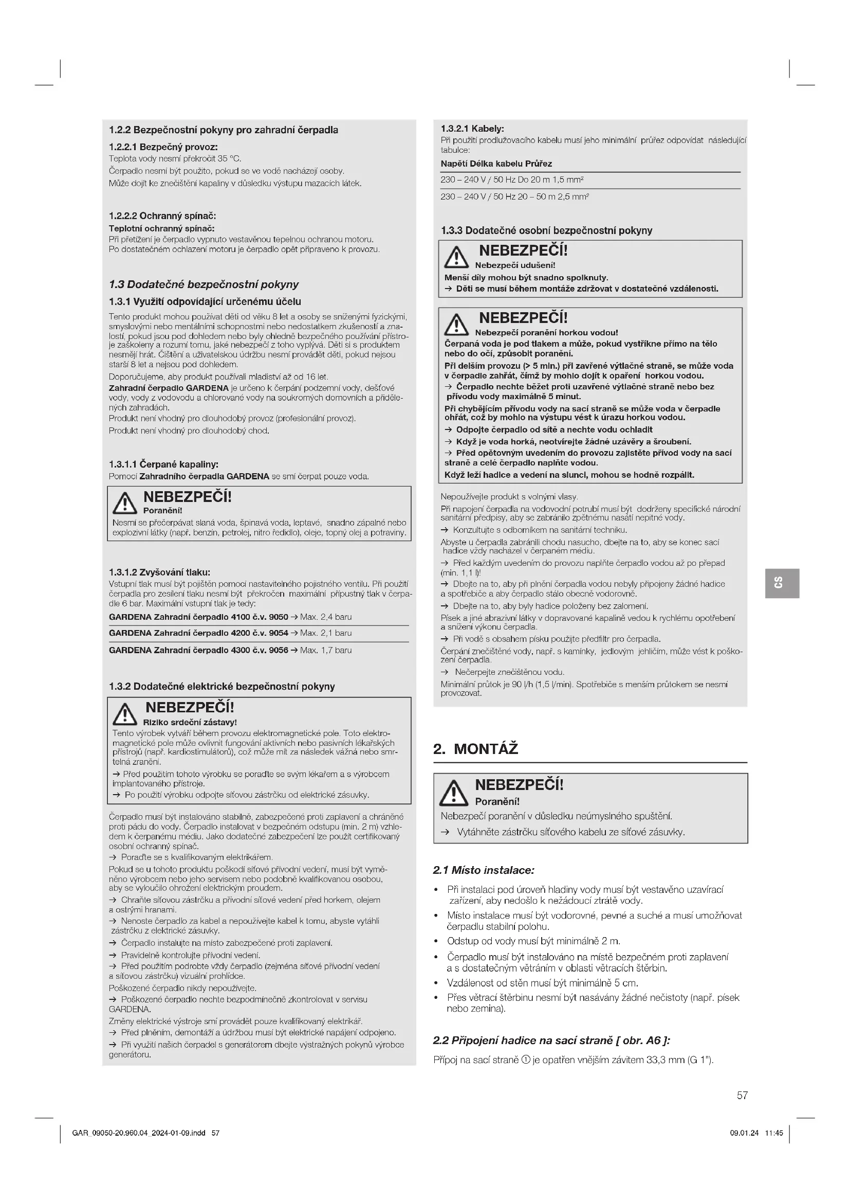 NEBEZPEČÍ!Riziko srdeční zástavy!Tento výrobek vytváří během provozu elektromagnetické pole. Toto elektro-magnetické pole může ovlivnit fungování aktivních nebo pasivních lékařských přístrojů (např. kardiostimulátorů), což může mít za následek vážná nebo smr-telná zranění. v Před použitím tohoto výrobku se poraďte se svým lékařem asvýrobcem implantovaného přístroje.v Po použití výrobku odpojte síťovou zástrčku od elektrické zásuvky.Čerpadlo musí být instalováno stabilně, zabezpečené proti zaplavení a chráněné proti pádu do vody. Čerpadlo instalovat v bezpečném odstupu (min. 2m) vzhle-dem k čerpanému médiu. Jako dodatečné zabezpečení lze použít certifikovaný osobní ochranný spínač.v Poraďte se s kvalifikovaným elektrikářem.Pokud se u tohoto produktu poškodí síťové přívodní vedení, musí být vymě-něnovýrobcem nebo jeho servisem nebo podobně kvalifikovanou osobou, aby se vyloučilo ohrožení elektrickým proudem.v Chraňte síťovou zástrčku a přívodní síťové vedení před horkem, olejem a ostrými hranami.v Nenoste čerpadlo za kabel a nepoužívejte kabel k tomu, abyste vytáhli zástrčku zelektrické zásuvky.v Čerpadlo instalujte na místo zabezpečené proti zaplavení.v Pravidelně kontrolujte přívodní vedení.v Před použitím podrobte vždy čerpadlo (zejména síťové přívodní vedení a síťovou zástrčku) vizuální prohlídce.Poškozené čerpadlo nikdy nepoužívejte.v Poškozené čerpadlo nechte bezpodmínečně zkontrolovat v servisu GARDENA.Změny elektrické výstroje smí provádět pouze kvalifikovaný elektrikář.v Před plněním, demontáží a údržbou musí být elektrické napájení odpojeno.v Při využití našich čerpadel s generátorem dbejte výstražných pokynů výrobce generátoru.1.3.2.1 Kabely:Při použití prodlužovacího kabelu musí jeho minimální průřez odpovídat následující tabulce:Napětí Délka kabelu Průřez230 – 240 V / 50 Hz Do 20 m 1,5 mm²230 – 240 V / 50 Hz 20 – 50 m 2,5 mm²
