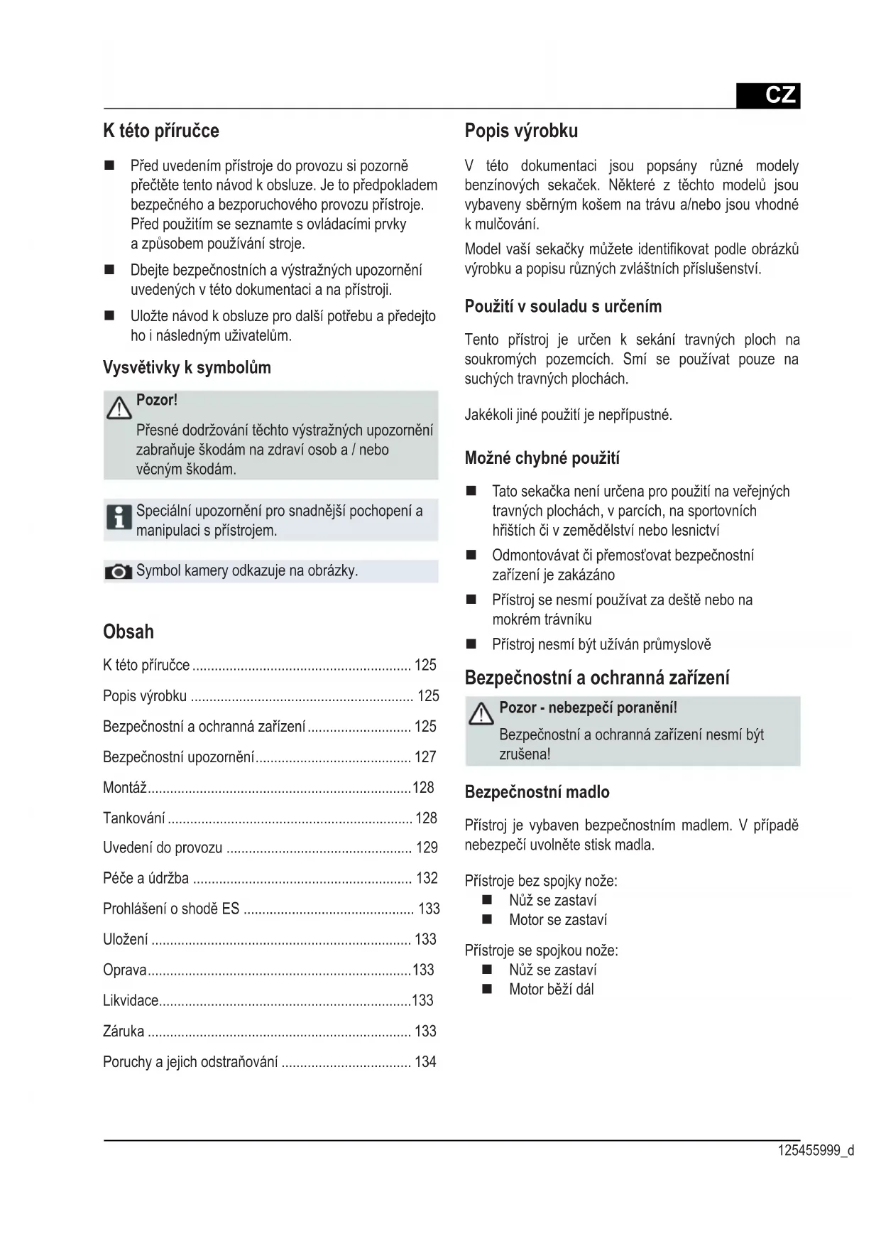 - Sprawdzić nóż Przy uszkodzeniach niepodanych w tej tabeli lub takich, których samodzielnie nie można usunąć, należy zwrócić się do odpowiedniego serwisu.CZ 125455999_d Obsah K této příručce ........................................................... 125 Popis výrobku ............................................................ 125 Bezpečnostní a ochranná zařízení ............................ 125 Bezpečnostní upozornění .......................................... 127 Montáž ....................................................................... 128 Tankování .................................................................. 128 Uvedení do provozu .................................................. 129 Péče a údržba ........................................................... 132 Prohlášení o shodě ES .............................................. 133 Uložení ...................................................................... 133 Oprava ....................................................................... 133 Likvidace .................................................................... 133 Záruka ....................................................................... 133 Poruchy a jejich odstraňování ................................... 134 K této příručce Před uvedením přístroje do provozu si pozorně přečtěte tento návod k obsluze. Je to předpokladem bezpečného a bezporuchového provozu přístroje. Před použitím se seznamte s ovládacími prvky a způsobem používání stroje. Dbejte bezpečnostních a výstražných upozornění uvedených v této dokumentaci a na přístroji. Uložte návod k obsluze pro další potřebu a předejto ho i následným uživatelům. Vysvětivky k symbolům Pozor! Přesné dodržování těchto výstražných upozornění zabraňuje škodám na zdraví osob a / nebo věcným škodám. Speciální upozornění pro snadnější pochopení a manipulaci s přístrojem. Symbol kamery odkazuje na obrázky. Popis výrobku V této dokumentaci jsou popsány různé modely benzínových sekaček. Některé z těchto modelů jsou vybaveny sběrným košem na trávu a/nebo jsou vhodné k mulčování. Model vaší sekačky můžete identifi kovat podle obrázků výrobku a popisu různých zvláštních příslušenství. Použití v souladu s určením Tento přístroj je určen k sekání travných ploch na soukromých pozemcích. Smí se používat pouze na suchých travných plochách. Jakékoli jiné použití je nepřípustné. Možné chybné použití Tato sekačka není určena pro použití na veřejných travných plochách, v parcích, na sportovních hřištích či v zemědělství nebo lesnictví Odmontovávat či přemosťovat bezpečnostní zařízení je zakázáno Přístroj se nesmí používat za deště nebo na mokrém trávníku Přístroj nesmí být užíván průmyslově Bezpečnostní a ochranná zařízení Pozor - nebezpečí poranění! Bezpečnostní a ochranná zařízení nesmí být zrušena! Bezpečnostní madlo Přístroj je vybaven bezpečnostním madlem. V případě nebezpečí uvolněte stisk madla. Přístroje bez spojky nože: Nůž se zastaví Motor se zastaví Přístroje se spojkou nože: Nůž se zastaví Motor běží dálCZ Překlad originálního návodu k použití Benzínová sekačka na trávu1 Lanko startéru 10 Spínač pohonu Vario*2 Spínač pohonu kol* 11 Návod k obsluze3 Bezpečnostní madlo 12 Kryt bočního vyhazování*4 Ergonomické nastavení výšky* 13 Víko*5 Ukazatel stavu paliva* 14 Mulčovací kit*6 Kryt těla sekačky 15 Elektrický startér Zapalování* 7Sběrný koš 16 Stručný průvodce 8 Nastavení výšky střihu 17 Dálkové ovládání plynu*9 Spojka nože* * dle provedeníSymboly na přístrojiPozor!Mimořádná opatrnost při manipulaci.Než začnete s pracemi na noži, vytáhněte nástrčku zapalovacích svíček! Než uvedete přístroj do provozu, bezpodmínečně si přečtěte tento návod k použití!STARTElektrický startér Zapalování:Před prováděním opravárenských a údržbářských prací vytáhnout klíč ze zapalování!V oblasti nebezpečí se nesmí zdržovat třetí osoby!Stručný průvodceOdbrzděte motorovou brzdu.Rukama ani nohama se nepřibližujte k nožům sekačky!Stručný průvodceAktivujte pohon kol.Dodržujte odstup od oblasti nebezpečí.Stručný průvodceDálkové ovládání plynu start / stop.