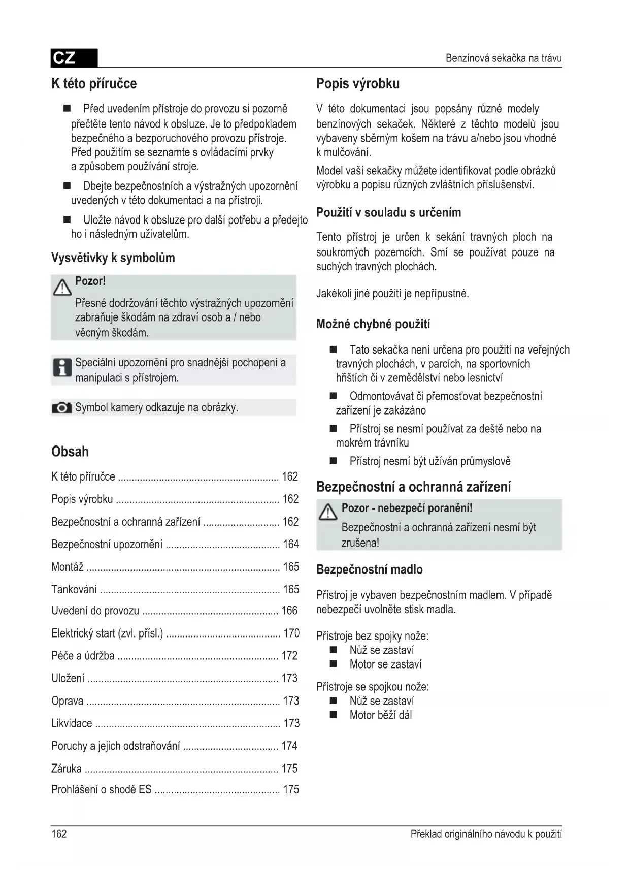 - Prohlášení o shodě ES K této příručce Před uvedením přístroje do provozu si pozorně přečtěte tento návod k obsluze. Je to předpokladem bezpečného a bezporuchového provozu přístroje. Před použitím se seznamte s ovládacími prvky a způsobem používání stroje. Dbejte bezpečnostních a výstražných upozornění uvedených v této dokumentaci a na přístroji. Uložte návod k obsluze pro další potřebu a předejto ho i následným uživatelům. Vysvětivky k symbolům Pozor! Přesné dodržování těchto výstražných upozornění zabraňuje škodám na zdraví osob a / nebo věcným škodám. Speciální upozornění pro snadnější pochopení a manipulaci s přístrojem. Symbol kamery odkazuje na obrázky. Popis výrobku V této dokumentaci jsou popsány různé modely benzínových sekaček. Některé z těchto modelů jsou vybaveny sběrným košem na trávu a/nebo jsou vhodné k mulčování. Model vaší sekačky můžete identikovat podle obrázků výrobku a popisu různých zvláštních příslušenství. Použití v souladu s určením Tento přístroj je určen k sekání travných ploch na soukromých pozemcích. Smí se používat pouze na suchých travných plochách. Jakékoli jiné použití je nepřípustné. Možné chybné použití Tato sekačka není určena pro použití na veřejných travných plochách, v parcích, na sportovních hřištích či v zemědělství nebo lesnictví Odmontovávat či přemosťovat bezpečnostní zařízení je zakázáno Přístroj se nesmí používat za deště nebo na mokrém trávníku Přístroj nesmí být užíván průmyslově Bezpečnostní a ochranná zařízení Pozor - nebezpečí poranění! Bezpečnostní a ochranná zařízení nesmí být zrušena! Bezpečnostní madlo Přístroj je vybaven bezpečnostním madlem. V případě nebezpečí uvolněte stisk madla. Přístroje bez spojky nože: Nůž se zastaví Motor se zastaví Přístroje se spojkou nože: Nůž se zastaví Motor běží dálCZ 163470 591_c 1 Lanko startéru 9 Nastavení výšky střihu* 2 Start, stop* 10 Spojka nože* 3 Spínač pohonu kol* 11 Spínač pohonu Vario* 4 Bezpečnostní madlo 12 Návod k obsluze 5 Ergonomické nastavení výšky* 13 Kryt bočního vyhazování* 6 Ukazatel stavu paliva* 14 Víko* 7 Kryt těla sekačky* 15 Mulčovací kit* 8 Sběrný koš* * dle provedení Symboly na přístroji Pozor! Mimořádná opatrnost při manipulaci. Než začnete s pracemi na noži, vytáhněte nástrčku zapalovacích svíček! Než uvedete přístroj do provozu, bezpodmínečně si přečtěte tento návod k použití! Odbrzděte motorovou brzdu. V oblasti nebezpečí se nesmí zdržovat třetí osoby! Aktivujte pohon kol. Rukama ani nohama se nepřibližujte k nožům sekačky! p. 175
