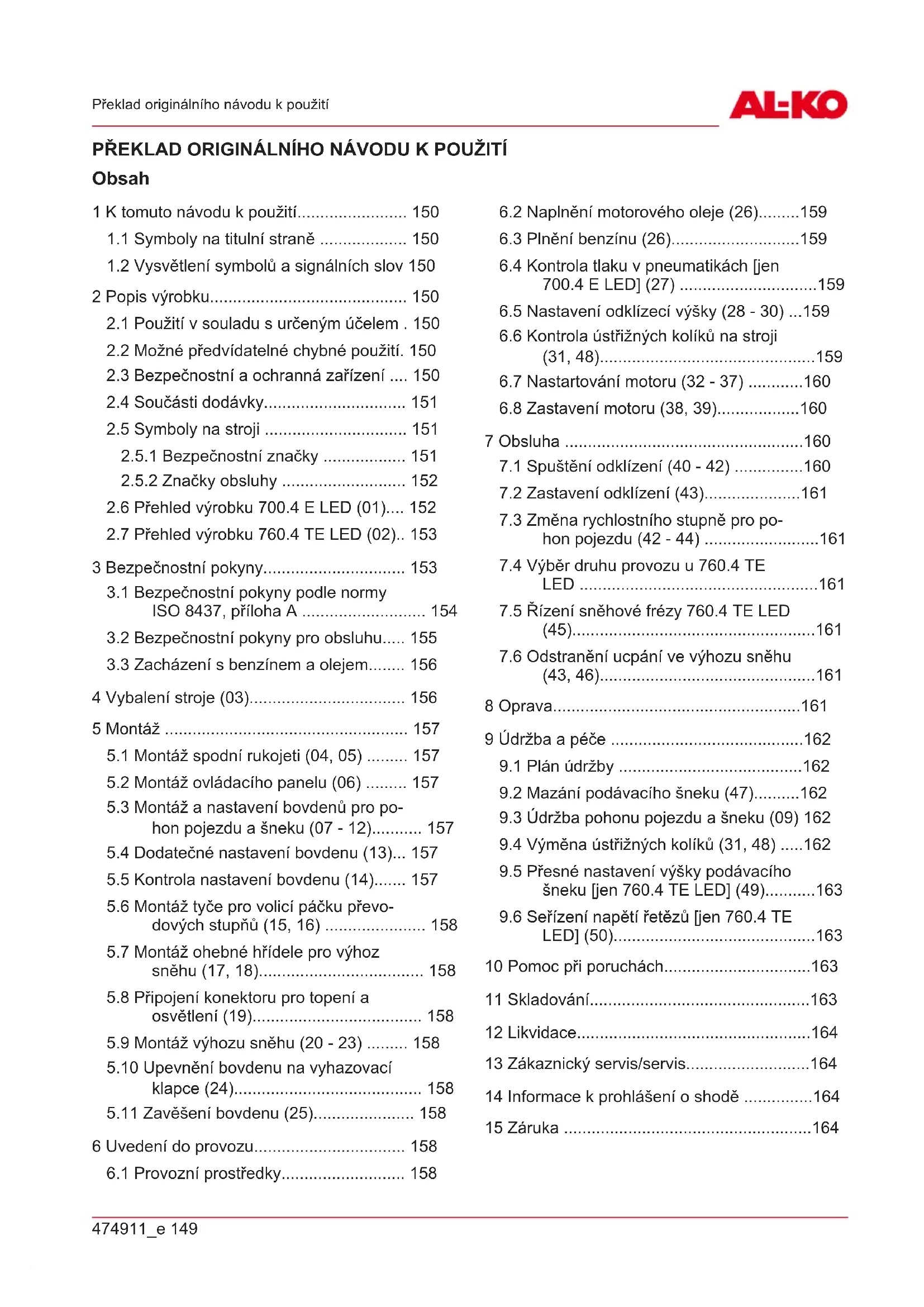 Neskladujte zařízení u zdrojů otevřeného ohně nebo tepla. Po každém použití stroj pořádně vyčistěte a, jsou-li k dispozici, umístěte všechny ochranné kryty. Přístroj uchovávejte na suchém, uzamyka- telném místě a mimo dosah dětí.CZ 164 SnowLine 700.4 E LED | SnowLine 760.4 TE LED Likvidace Při delším skladování stroje, např. po zimě, musí- te provést následující práce, aby nedošlo k po- škození: