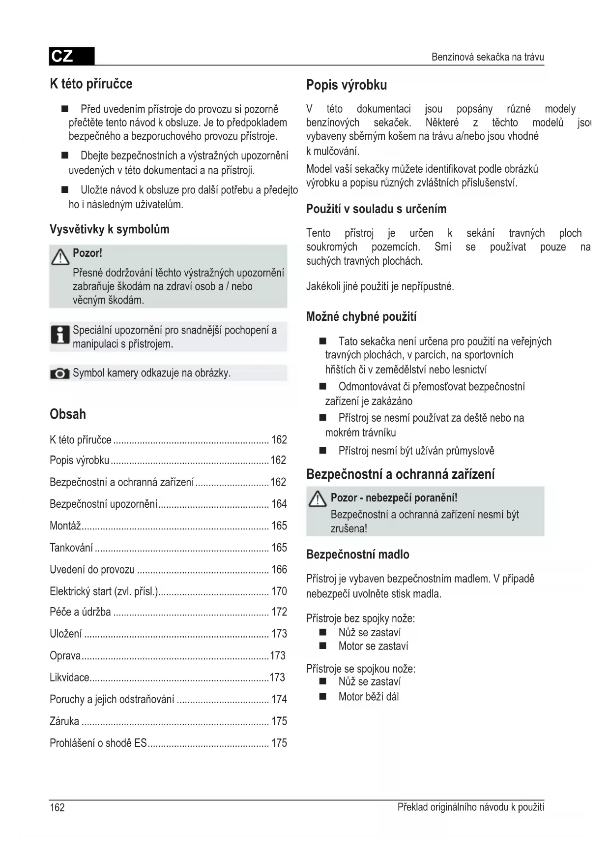 - ProhlášeníoshoděES K této příručce Předuvedenímpřístrojedoprovozusipozorně přečtětetentonávodkobsluze.Jetopředpokladem bezpečnéhoabezporuchovéhoprovozupřístroje. Dbejtebezpečnostníchavýstražnýchupozornění uvedenýchvtétodokumentacianapřístroji. Uložtenávodkobsluzeprodalšípotřebuapředejto hoináslednýmuživatelům. Vysvětivky k symbolům Pozor! Přesnédodržovánítěchtovýstražnýchupozornění zabraňuješkodámnazdravíosoba/nebo věcnýmškodám. Speciálníupozorněníprosnadnějšípochopenía manipulacispřístrojem. Symbol kamery odkazuje na obrázky. Popis výrobku V této dokumentaci jsou popsány různé modely benzínových sekaček. Některé z těchto modelů jsou vybavenysběrnýmkošemnatrávua/nebojsouvhodné kmulčování. Modelvašísekačkymůžeteidentikovatpodleobrázků výrobkuapopisurůznýchzvláštníchpříslušenství. Použití v souladu s určením Tento přístroj je určen k sekání travných ploch na soukromých pozemcích. Smí se používat pouze na suchých travných plochách. Jakékolijinépoužitíjenepřípustné. Možné chybné použití Tatosekačkaneníurčenapropoužitínaveřejných travnýchplochách,vparcích,nasportovních hřištíchčivzemědělstvínebolesnictví Odmontovávatčipřemosťovatbezpečnostní zařízeníjezakázáno Přístrojsenesmípoužívatzadeštěnebona mokrémtrávníku Přístrojnesmíbýtužívánprůmyslově Bezpečnostní a ochranná zařízení Pozor - nebezpečí poranění! Bezpečnostníaochrannázařízenínesmíbýt zrušena! Bezpečnostní madlo Přístrojjevybavenbezpečnostnímmadlem.Vpřípadě nebezpečíuvolnětestiskmadla. Přístrojebezspojkynože: Nůžsezastaví Motorsezastaví Přístrojesespojkounože: Nůžsezastaví MotorběžídálCZ 163470 592_c 1 Lanko startéru 9 Nastavenívýškystřihu* 2 Start, stop* 10 Spojkanože* 3 Spínačpohonukol* 11 SpínačpohonuVario* 4 Bezpečnostnímadlo 12 Návod k obsluze 5 Ergonomickénastavenívýšky* 13 Krytbočníhovyhazování* 6 Ukazatel stavu paliva* 14 Víko* 7 Kryttělasekačky* 15 Mulčovacíkit* 8 Sběrnýkoš* * dle provedení Symboly na přístroji Pozor! Mimořádnáopatrnostpřimanipulaci. Nežzačnetespraceminanoži, vytáhnětenástrčkuzapalovacíchsvíček! Nežuvedetepřístrojdoprovozu,bezpodmínečněsi přečtětetentonávodkpoužití! Odbrzdětemotorovoubrzdu. Voblastinebezpečísenesmízdržovattřetíosoby! Aktivujte pohon kol. Rukamaaninohamasenepřibližujteknožům sekačky! p. 175