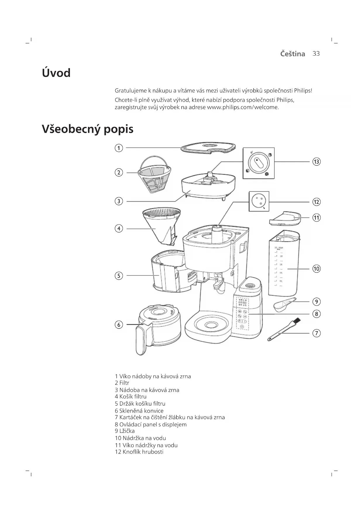 Čeština Úvod Gratulujeme knákupu avítáme vás mezi uživateli výrobků společnosti Philips! Chcete-li plně využívat výhod, které nabízí podpora společnosti Philips, zaregistrujte svůj výrobek na adrese www.philips.com/welcome. Všeobecný popis