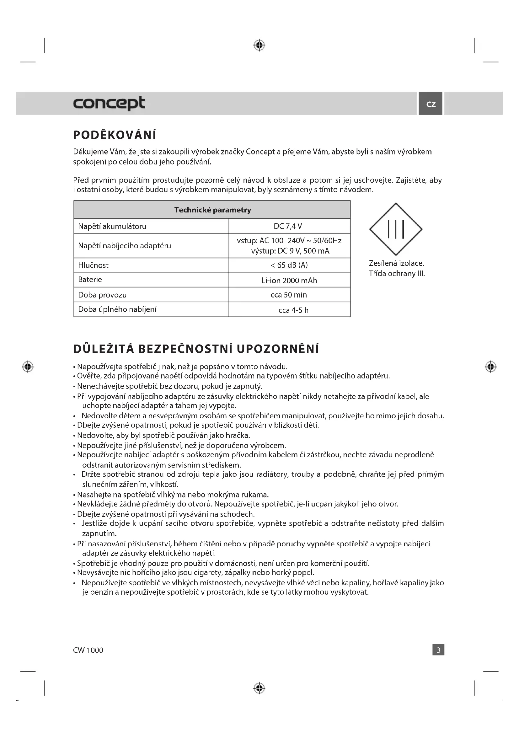 SK PL HU LV EN DE FR IT ES CW 1000 Window vacuum cleaner 3 in 1 Fenstersauger 3 in 1 Aspirateur pour fenêtres 3-en-1 Aspirapolvere per finestre 3 in 1 Aspiradora para ventanas 3 en 1@PODĚKOVÁNÍ Děkujeme Vám, že jste si zakoupili výrobek značky Concept a přejeme Vám, abyste byli s naším výrobkem spokojeni po celou dobu jeho používání. Před prvním použitím prostudujte pozorně celý návod k obsluze a potom si jej uschovejte. Zajistěte, aby i ostatní osoby, které budou s výrobkem manipulovat, byly seznámeny s tímto návodem. Technické parametry Napětí akumulátoru DC 7,4 V Napětí nabíjecího adaptéru vstup: AC 100–240V ~ 50/60Hz výstup: DC 9 V, 500 mA Hlučnost < 65 dB (A) Baterie Li-ion 2000 mAh Doba provozu cca 50 min Doba úplného nabíjení cca 4-5 h DŮLEŽITÁ BEZPEČNOSTNÍ UPOZORNĚNÍ
