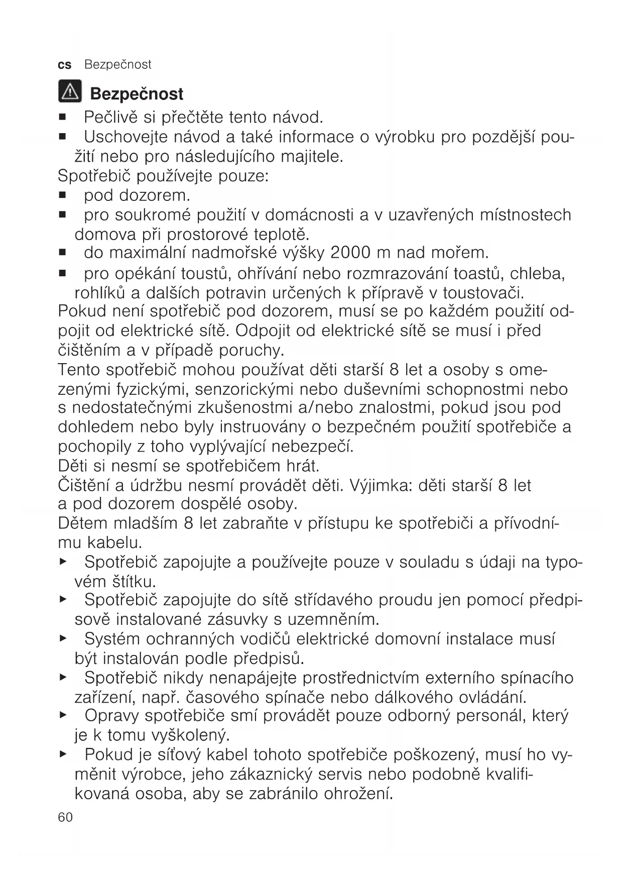 Bezpečnost ¡ Pečlivě si přečtěte tento návod. ¡ Uschovejte návod a také informace o výrobku pro pozdější pou- žití nebo pro následujícího majitele. Spotřebič používejte pouze: ¡ pod dozorem. ¡ pro soukromé použití v domácnosti a v uzavřených místnostech domova při prostorové teplotě. ¡ do maximální nadmořské výšky 2000m nad mořem. ¡ pro opékání toustů, ohřívání nebo rozmrazování toastů, chleba, rohlíků a dalších potravin určených k přípravě v toustovači. Pokud není spotřebič pod dozorem, musí se po každém použití od- pojit od elektrické sítě. Odpojit od elektrické sítě se musí i před čištěním a v případě poruchy. Tento spotřebič mohou používat děti starší 8 let a osoby s ome- zenými fyzickými, senzorickými nebo duševními schopnostmi nebo s nedostatečnými zkušenostmi a/nebo znalostmi, pokud jsou pod dohledem nebo byly instruovány o bezpečném použití spotřebiče a pochopily z toho vyplývající nebezpečí. Děti si nesmí se spotřebičem hrát. Čištění aúdržbu nesmí provádět děti. Výjimka: děti starší 8let apod dozorem dospělé osoby. Dětem mladším 8let zabraňte vpřístupu ke spotřebiči apřívodní- mu kabelu. ▶ Spotřebič zapojujte apoužívejte pouze vsouladu súdaji na typo- vém štítku. ▶ Spotřebič zapojujte do sítě střídavého proudu jen pomocí předpi- sově instalované zásuvky suzemněním. ▶ Systém ochranných vodičů elektrické domovní instalace musí být instalován podle předpisů. ▶ Spotřebič nikdy nenapájejte prostřednictvím externího spínacího zařízení, např. časového spínače nebo dálkového ovládání. ▶ Opravy spotřebiče smí provádět pouze odborný personál, který je ktomu vyškolený. ▶ Pokud je síťový kabel tohoto spotřebiče poškozený, musí ho vy- měnit výrobce, jeho zákaznický servis nebo podobně kvalifi- kovaná osoba, aby se zabránilo ohrožení.Bezpečnost cs