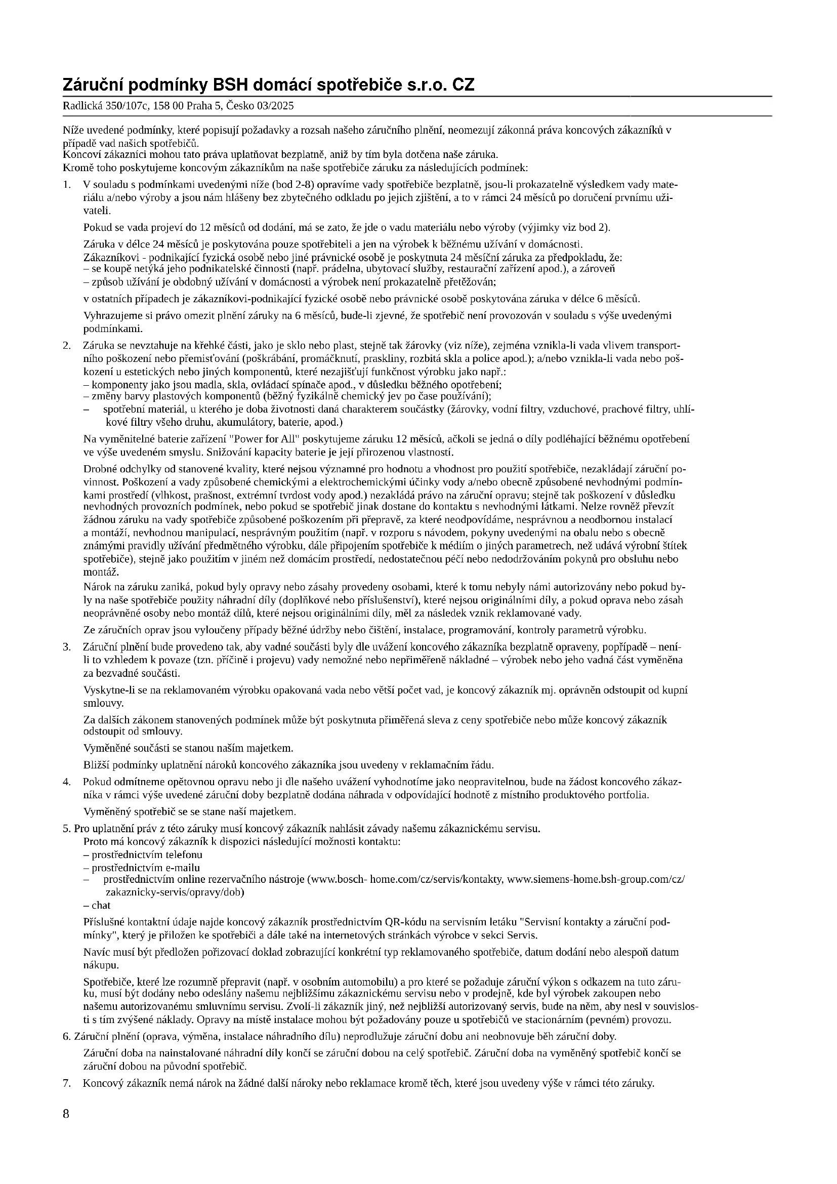 указанията за инсталиране, предоставени на купувача. 7Záruční podmínky BSH domácí spotřebiče s.r.o. CZ Radlická 350/107c, 158 00 Praha 5, Česko 03/2025 Níže uvedené podmínky, které popisují požadavky a rozsah našeho záručního plnění, neomezují zákonná práva koncových zákazníků v případě vad našich spotřebičů. Koncoví zákazníci mohou tato práva uplatňovat bezplatně, aniž by tím byla dotčena naše záruka. Kromě toho poskytujeme koncovým zákazníkům na naše spotřebiče záruku za následujících podmínek: 1. V souladu s podmínkami uvedenými níže (bod 2-8) opravíme vady spotřebiče bezplatně, jsou-li prokazatelně výsledkem vady mate- riálu a/nebo výroby a jsou nám hlášeny bez zbytečného odkladu po jejich zjištění, a to v rámci 24 měsíců po doručení prvnímu uži- vateli. Pokud se vada projeví do 12 měsíců od dodání, má se zato, že jde o vadu materiálu nebo výroby (výjimky viz bod 2). Záruka v délce 24 měsíců je poskytována pouze spotřebiteli a jen na výrobek k běžnému užívání v domácnosti. Zákazníkovi - podnikající fyzická osobě nebo jiné právnické osobě je poskytnuta 24 měsíční záruka za předpokladu, že: – se koupě netýká jeho podnikatelské činnosti (např. prádelna, ubytovací služby, restaurační zařízení apod.), a zároveň – způsob užívání je obdobný užívání v domácnosti a výrobek není prokazatelně přetěžován; v ostatních případech je zákazníkovi-podnikající fyzické osobě nebo právnické osobě poskytována záruka v délce 6 měsíců. Vyhrazujeme si právo omezit plnění záruky na 6 měsíců, bude-li zjevné, že spotřebič není provozován v souladu s výše uvedenými podmínkami. 2. Záruka se nevztahuje na křehké části, jako je sklo nebo plast, stejně tak žárovky (viz níže), zejména vznikla-li vada vlivem transport- ního poškození nebo přemisťování (poškrábání, promáčknutí, praskliny, rozbitá skla a police apod.); a/nebo vznikla-li vada nebo poš- kození u estetických nebo jiných komponentů, které nezajišťují funkčnost výrobku jako např.: – komponenty jako jsou madla, skla, ovládací spínače apod., v důsledku běžného opotřebení; – změny barvy plastových komponentů (běžný fyzikálně chemický jev po čase používání); – spotřební materiál, u kterého je doba životnosti daná charakterem součástky (žárovky, vodní filtry, vzduchové, prachové filtry, uhlí- kové filtry všeho druhu, akumulátory, baterie, apod.) Na vyměnitelné baterie zařízení "Power for All" poskytujeme záruku 12 měsíců, ačkoli se jedná o díly podléhající běžnému opotřebení ve výše uvedeném smyslu. Snižování kapacity baterie je její přirozenou vlastností. Drobné odchylky od stanovené kvality, které nejsou významné pro hodnotu a vhodnost pro použití spotřebiče, nezakládají záruční po- vinnost. Poškození a vady způsobené chemickými a elektrochemickými účinky vody a/nebo obecně způsobené nevhodnými podmín- kami prostředí (vlhkost, prašnost, extrémní tvrdost vody apod.) nezakládá právo na záruční opravu; stejně tak poškození v důsledku nevhodných provozních podmínek, nebo pokud se spotřebič jinak dostane do kontaktu s nevhodnými látkami. Nelze rovněž převzít žádnou záruku na vady spotřebiče způsobené poškozením při přepravě, za které neodpovídáme, nesprávnou a neodbornou instalací a montáží, nevhodnou manipulací, nesprávným použitím (např. v rozporu s návodem, pokyny uvedenými na obalu nebo s obecně známými pravidly užívání předmětného výrobku, dále připojením spotřebiče k médiím o jiných parametrech, než udává výrobní štítek spotřebiče), stejně jako použitím v jiném než domácím prostředí, nedostatečnou péčí nebo nedodržováním pokynů pro obsluhu nebo montáž. Nárok na záruku zaniká, pokud byly opravy nebo zásahy provedeny osobami, které k tomu nebyly námi autorizovány nebo pokud by- ly na naše spotřebiče použity náhradní díly (doplňkové nebo příslušenství), které nejsou originálními díly, a pokud oprava nebo zásah neoprávněné osoby nebo montáž dílů, které nejsou originálními díly, měl za následek vznik reklamované vady. Ze záručních oprav jsou vyloučeny případy běžné údržby nebo čištění, instalace, programování, kontroly parametrů výrobku. 3. Záruční plnění bude provedeno tak, aby vadné součásti byly dle uvážení koncového zákazníka bezplatně opraveny, popřípadě – není- li to vzhledem k povaze (tzn. příčině i projevu) vady nemožné nebo nepřiměřeně nákladné – výrobek nebo jeho vadná část vyměněna za bezvadné součásti. Vyskytne-li se na reklamovaném výrobku opakovaná vada nebo větší počet vad, je koncový zákazník mj. oprávněn odstoupit od kupní smlouvy. Za dalších zákonem stanovených podmínek může být poskytnuta přiměřená sleva z ceny spotřebiče nebo může koncový zákazník odstoupit od smlouvy. Vyměněné součásti se stanou naším majetkem. Bližší podmínky uplatnění nároků koncového zákazníka jsou uvedeny v reklamačním řádu. 4. Pokud odmítneme opětovnou opravu nebo ji dle našeho uvážení vyhodnotíme jako neopravitelnou, bude na žádost koncového zákaz- níka v rámci výše uvedené záruční doby bezplatně dodána náhrada v odpovídající hodnotě z místního produktového portfolia. Vyměněný spotřebič se se stane naší majetkem.