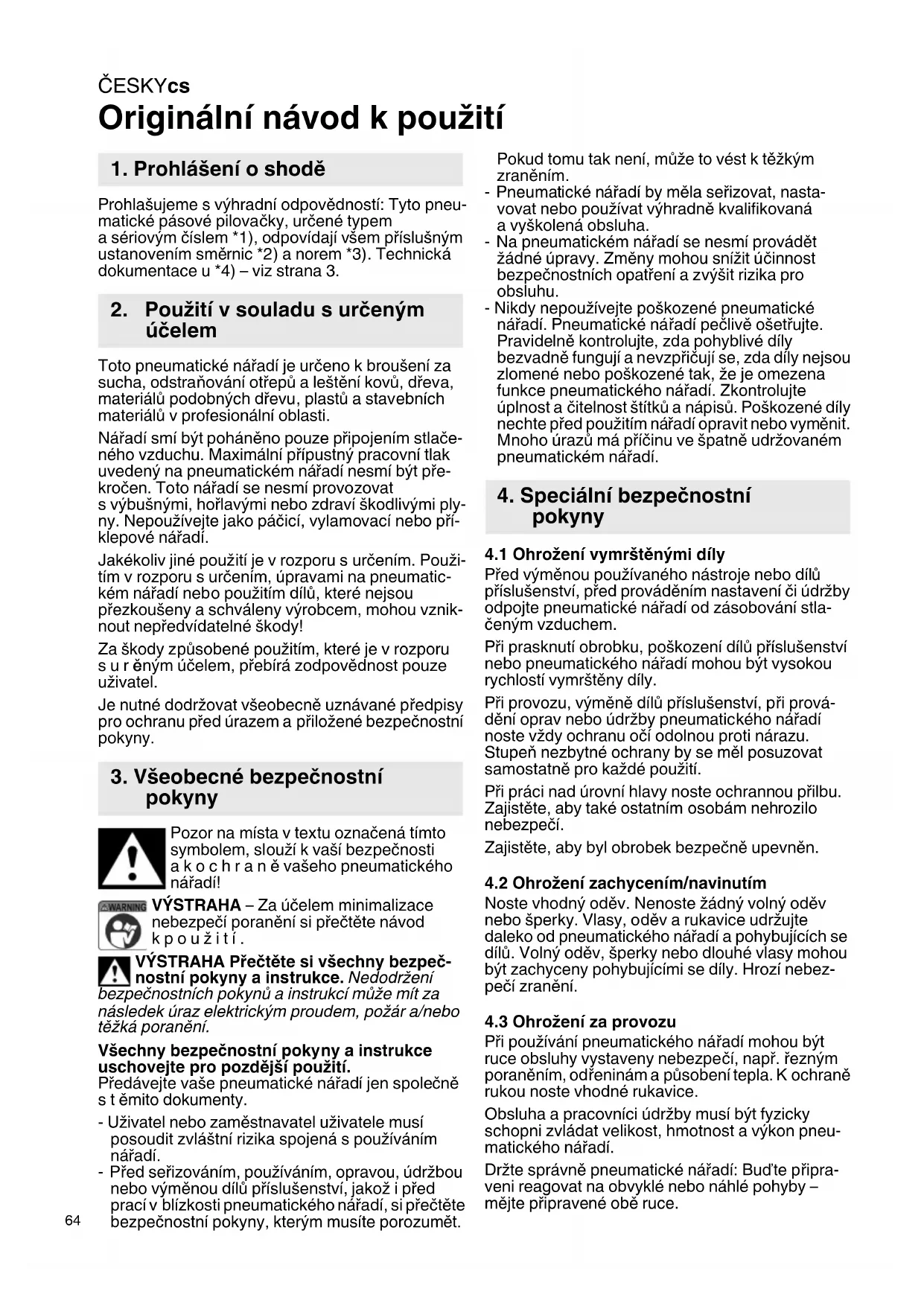 Originální návod k použití Prohlašujeme s výhradní odpovědností: Tyto pneu- matické pásové pilovačky, určené typem a sériovým číslem *1), odpovídají všem příslušným ustanovením směrnic *2) a norem *3). Technická dokumentace u *4) – viz strana 3. Toto pneumatické nářadí je určeno k broušení za sucha, odstraňování otřepů aleštění kovů, dřeva, materiálů podobných dřevu, plastů astavebních materiálů v profesionální oblasti. Nářadí smí být poháněno pouze připojením stlače- ného vzduchu. Maximální přípustný pracovní tlak uvedený na pneumatickém nářadí nesmí být pře- kročen. Toto nářadí se nesmí provozovat s výbušnými, hořlavými nebo zdraví škodlivými ply- ny. Nepoužívejte jako páčicí, vylamovací nebo pří- klepové nářadí. Jakékoliv jiné použití je v rozporu s určením. Použi- tím v rozporu s určením, úpravami na pneumatic- kém nářadí nebo použitím dílů, které nejsou přezkoušeny a schváleny výrobcem, mohou vznik- nout nepředvídatelné škody! Za škody způsobené použitím, které je v rozporu surč eným účelem, přebírá zodpovědnost pouze uživatel. Je nutné dodržovat všeobecně uznávané předpisy pro ochranu před úrazem a přiložené bezpečnostní pokyny. Pozor na místa v textu označená tímto symbolem, slouží k vaší bezpečnosti akochraně vašeho pneumatického nářadí! VÝSTRAHA – Za účelem minimalizace nebezpečí poranění si přečtěte návod kpoužití. VÝSTRAHA Přečtěte si všechny bezpeč- nostní pokyny a instrukce. Nedodržení bezpečnostních pokynů ainstrukcí může mít za následek úraz elektrickým proudem, požár a/nebo těžká poranění. Všechny bezpečnostní pokyny a instrukce uschovejte pro pozdější použití. Předávejte vaše pneumatické nářadí jen společně stěmito dokumenty. - Uživatel nebo zaměstnavatel uživatele musí posoudit zvláštní rizika spojená s používáním nářadí.