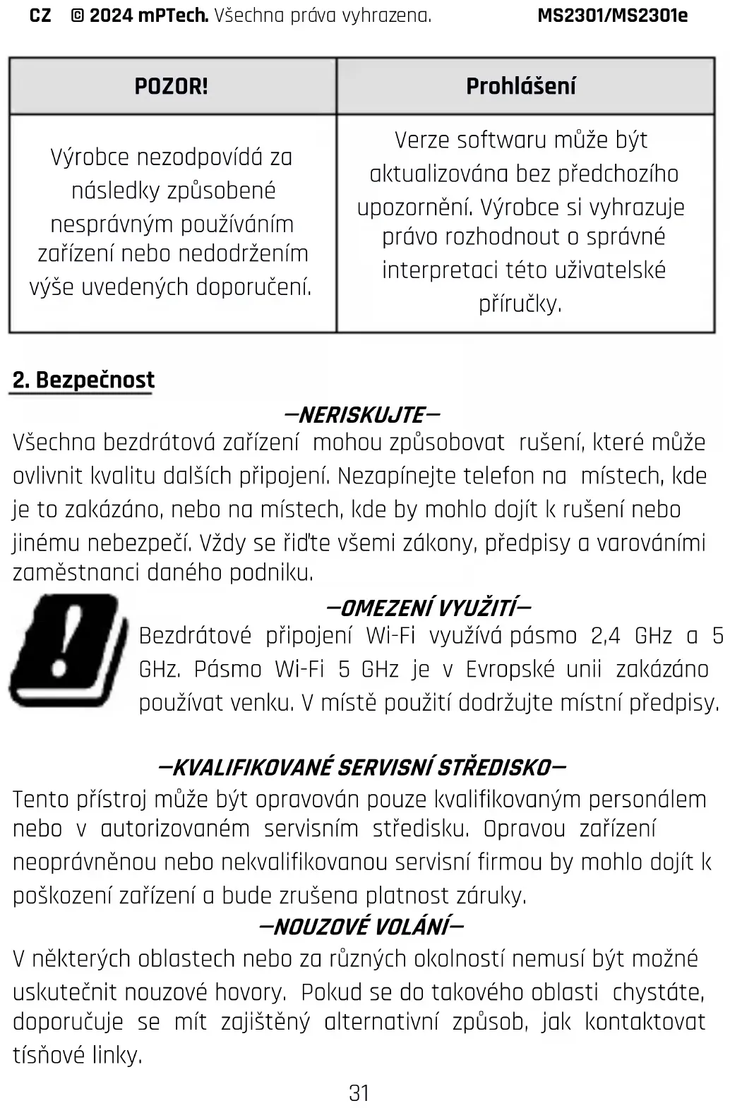 V některých oblastech nebo za různých okolností nemusí být možné uskutečnit nouzové hovory. Pokud se do takového oblasti chystáte, doporučuje se mít zajištěný alternativní způsob, jak kontaktovat tísňové linky.CZ © 2024 mPTech. Všechna práva vyhrazena. MS2301/MS2301e