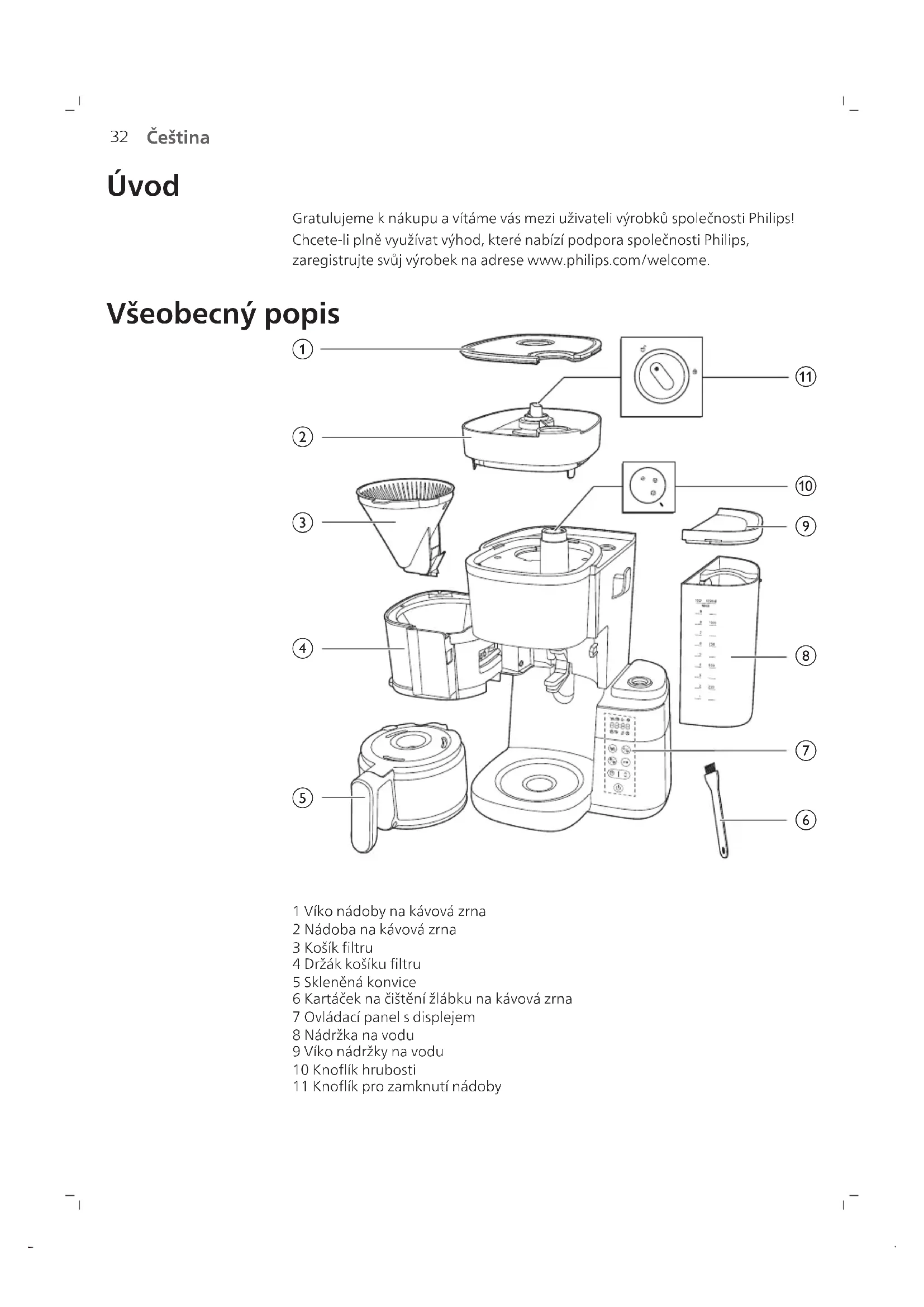 Čeština Úvod Gratulujeme knákupu avítáme vás mezi uživateli výrobků společnosti Philips! Chcete-li plně využívat výhod, které nabízí podpora společnosti Philips, zaregistrujte svůj výrobek na adrese www.philips.com/welcome. Všeobecný popis