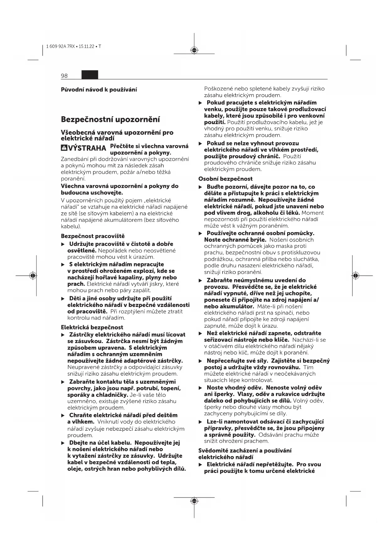 Úroveň vibrací aúroveň hluku, které jsou uvedené vtěchto pokynech, byly změřeny pomocí normované měřicí metody alze je 100 cs 1 609 92A 7RX • 15.11.22 • Tpoužít pro vzájemné porovnání elektronářadí. Hodí se ipro předběžný odhad zatížení vibracemi ahlukem. Uvedená úroveň vibrací aúroveň hluku reprezentuje hlavní použití elektronářadí. Pokud se ovšem bude elektronářadí používat pro jiné práce, sjinými nástroji nebo snedostatečnou údržbou, může se úroveň hluku aúroveň vibrací lišit. To může zatížení vibracemi ahlukem po celou pracovní dobu zřetelně zvýšit. Pro přesný odhad zatížení vibracemi ahlukem by měly být zohledněny idoby, kdy je nářadí vypnuté nebo běží, ale ve skutečnosti se nepoužívá. To může zatížení vibracemi ahlukem po celou pracovní dobu výrazně snížit. Stanovte dodatečná bezpečnostní opatření kochraně obsluhy před účinky vibrací, jako je např. údržba elektronářadí anástrojů, udržování teplých rukou, organizace pracovních procesů. AkumulátorČeština Nabíjení akumulátoruČeština u Používejte pouze nabíječky uvedené vtechnických údajích. Jen tyto nabíječky jsou přizpůsobené pro lithium-iontový akumulátor používaný svaším elektronářadím. Upozornění: Lithium-iontové akumulátory se na základě mezinárodních dopravních předpisů dodávají částečně nabité. Aby byl zaručen plný výkon akumulátoru, před prvním použitím akumulátor úplně nabijte. Nasazení akumulátoruČeština Vložte nabitý akumulátor do uchycení akumulátoru tak, aby citelně zaskočil. Vyjmutí akumulátoruČeština Pro vyjmutí akumulátoru stiskněte odjišťovací tlačítko avytáhněte akumulátor. Nepoužívejte přitom násilí. Akumulátorje opatřený 2stupni zajištění, které mají zabránit vypadnutí akumulátoru při neúmyslném stisknutí odjišťovacího tlačítka. Pokud je akumulátor nasazený do elektrického nářadí, drží ho vpříslušné poloze pružina. Ukazatel stavu nabití akumulátoruČeština Zelené LED ukazatele stavu nabití akumulátoru indikují stav nabití akumulátoru. Zbezpečnostních důvodů je zjištění stavu nabití možné pouze při vypnutém elektronářadí. Pro zobrazení stavu nabití stiskněte tlačítko ukazatele stavu nabití nebo . Je to možné také při vyjmutém akumulátoru. Pokud po stisknutí tlačítka ukazatele stavu nabití nesvítí žádná LED, je akumulátor vadný amusí se vyměnit. Typ akumulátoru GBA 18V...Čeština LED Kapacita Trvale svítí 3 zelené 60–100% Trvale svítí 2 zelené 30–60% Trvale svítí 1 zelená 5–30% Bliká 1 zelená 0–5% Typ akumulátoru ProCORE18V...Čeština LED Kapacita Trvale svítí 5 zelených 80–100% Trvale svítí 4 zelené 60–80% Trvale svítí 3 zelené 40–60% Trvale svítí 2 zelené 20–40% Trvale svítí 1 zelená 5–20% Bliká 1 zelená 0–5% Upozornění pro optimální zacházení s akumulátoremČeština Akumulátor chraňte před vlhkostí a vodou. Akumulátor skladujte pouze v teplotním rozmezí od −20 °C do 50 °C. Nenechávejte akumulátor ležet např. v létě v autě. Příležitostně vyčistěte větrací otvory akumulátoru měkkým, čistým a suchým štětcem. Výrazně kratší doba chodu po nabití ukazuje, že je akumulátor opotřebovaný a musí se vyměnit. Dodržujte pokyny pro likvidaci. MontážČeština u Před každou prací na elektronářadí (např. údržba, výměna nástrojů) apři jeho přepravě auskladnění vyjměte akumulátor. Při neúmyslném stisknutí vypínače hrozí nebezpečí poranění. Nasazení/výměna pilového pásuČeština u Při montáži pilového pásu noste ochranné rukavice. Při dotknutí pilového pásu hrozí nebezpečí poranění. u Vždy noste ochranné brýle. Ochranné brýle snižují riziko poranění. Nasazení pilového pásu (vizobrázkyA–E)Čeština Povolte obě uzavírací spony (4) ❶ aodklopte kryt(13) ❷. Otočte páčku(9) o180° ve směru otáčení až nadoraz. Postupně zaveďte pilový pás(6) do vedení pilového pásu(7). Zadní strana pilového pásu se cs 101 1 609 92A 7RX • 15.11.22 • Tmusí dotýkat ložisek ve spodní části vedení pilového pásu(7). Pilový pás(6) veďte postupně okolo obou kladek(15). Otočte páčku(9) o180° zpátky až nadoraz. Zkontrolujte, zda je pilový pás(6) správně umístěný na obou kladkách(15). Přiklopte zpátky kryt(13) tak, aby uzavírací spony(4) zaskočily. u Zkontrolujte, zda je pilový pás(6) správně nasazený. Elektrické nářadí několikrát krátce zapněte avypněte. Nesprávně namontovaný pilový pás se může uvolnit aporanit vás. Odsávání prachu/třísekČeština Prach zmateriálů, jako jsou nátěry sobsahem olova, některé druhy dřeva, minerály akov, může být zdraví škodlivý. Kontakt sprachem či vdechnutí mohou vyvolat alergické reakce a/ nebo onemocnění dýchacích cest obsluhy nebo vblízkosti se nacházejících osob. Určitý prach, jako dubový nebo bukový prach, je pokládán za karcinogenní, zvláště ve spojení spřídavnými látkami pro ošetření dřeva (chromát, ochranné prostředky na dřevo). Materiál obsahující azbest smějí opracovávat pouze specialisté. – Zajistěte dobré větrání pracoviště. – Je doporučeno nosit ochrannou dýchací masku střídou filtruP2. Dodržujte předpisy pro obráběné materiály platné vpříslušné zemi. u Zabraňte hromadění prachu na pracovišti. Prach se může lehce vznítit. ProvozČeština Uvedení do provozuČeština Zapnutí avypnutíČeština Pro zapnutí elektrického nářadí stiskněte nejprve blokování zapnutí(1) apoté vypínač(2) adržte ho stisknutý. Světlo(10) svítí při mírně nebo úplně stisknutém vypínači(2) aumožňuje osvětlení pracovního prostoru při nepříznivých světelných podmínkách. Pro v