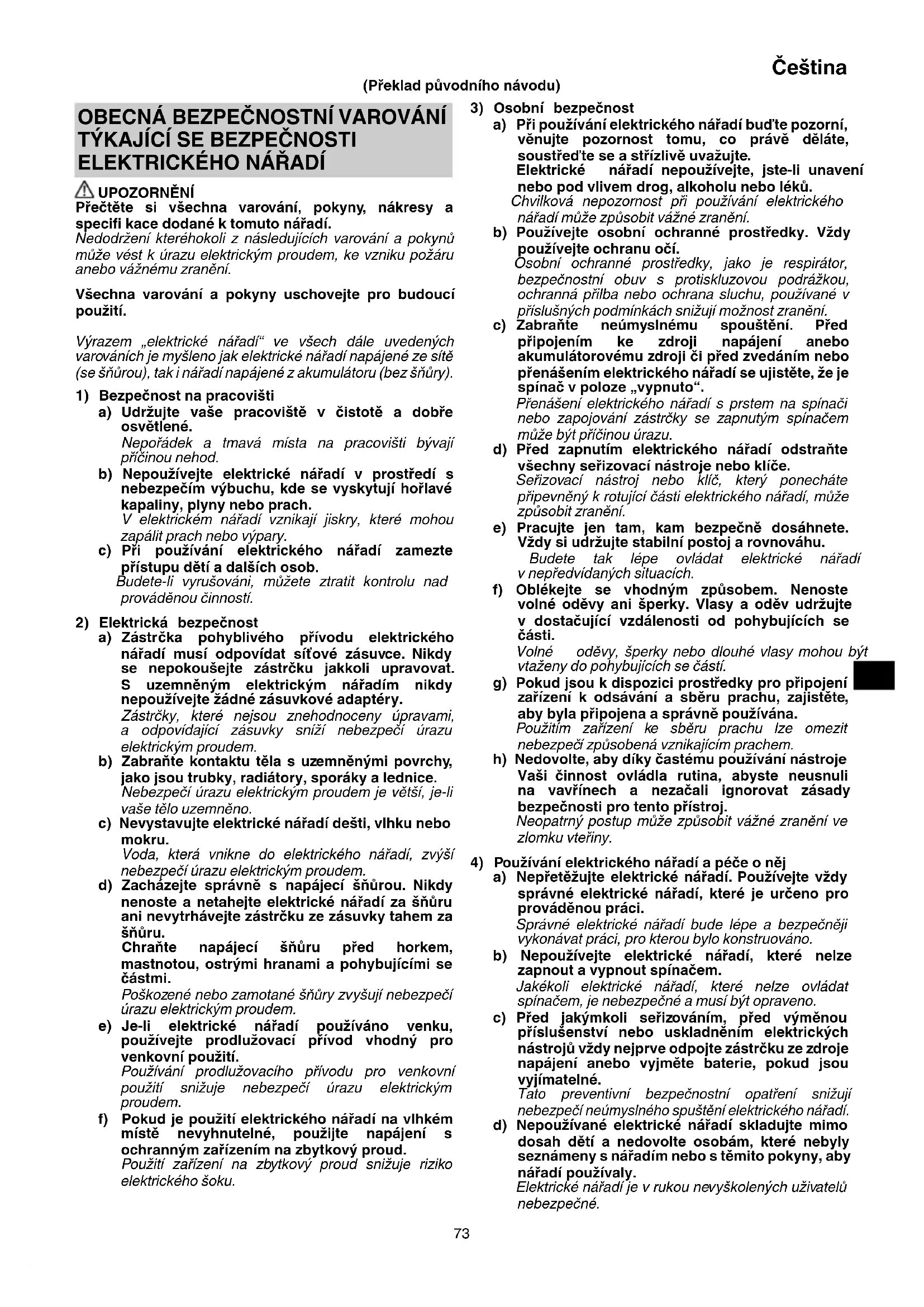 UPOZORNĚNÍ Přečtěte si všechna varování, pokyny, nákresy a specifi kace dodané k tomuto nářadí. Nedodržení kteréhokoli z následujících varování a pokynů může vést k úrazu elektrickým proudem, ke vzniku požáru anebo vážnému zranění. Všechna varování a pokyny uschovejte pro budoucí použití. Výrazem „elektrické nářadí“ ve všech dále uvedených varováních je myšleno jak elektrické nářadí napájené ze sítě (se šňůrou), tak i nářadí napájené z akumulátoru (bez šňůry).