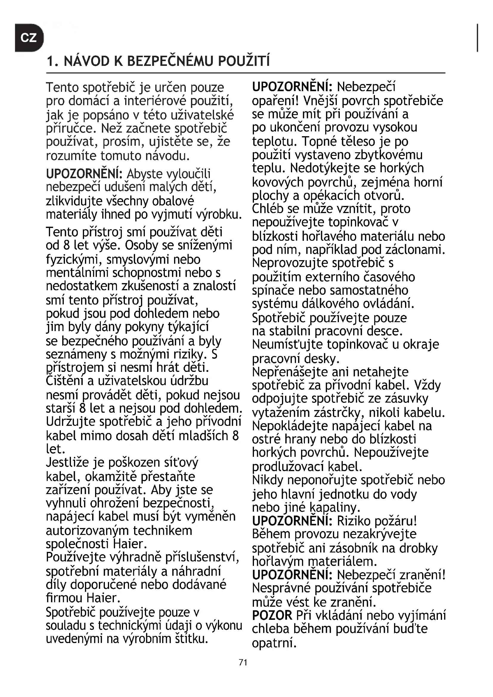 - Rozwiązanie: nacisnąć dowolny przycisk lub opuścić dźwignię podnoszenia.71 Tento spotřebič je určen pouze pro domácí a interiérové použití, jak je popsáno v této uživatelské příručce. Než začnete spotřebič používat, prosím, ujistěte se, že rozumíte tomuto návodu. UPOZORNĚNÍ: Abyste vyloučili nebezpečí udušení malých dětí, zlikvidujte všechny obalové materiály ihned po vyjmutí výrobku. Tento přístroj smí používat děti od 8 let výše. Osoby se sníženými fyzickými, smyslovými nebo mentálními schopnostmi nebo s nedostatkem zkušeností a znalostí smí tento přístroj používat, pokud jsou pod dohledem nebo jim byly dány pokyny týkající se bezpečného používání a byly seznámeny s možnými riziky. S přístrojem si nesmí hrát děti. Čištění a uživatelskou údržbu nesmí provádět děti, pokud nejsou starší 8 let a nejsou pod dohledem. Udržujte spotřebič a jeho přívodní kabel mimo dosah dětí mladších 8 let. Jestliže je poškozen síťový kabel, okamžitě přestaňte zařízení používat. Aby jste se vyhnuli ohrožení bezpečnosti, napájecí kabel musí být vyměněn autorizovaným technikem společnosti Haier. Používejte výhradně příslušenství, spotřební materiály a náhradní díly doporučené nebo dodávané rmou Haier. Spotřebič používejte pouze v souladu s technickými údaji o výkonu uvedenými na výrobním štítku. UPOZORNĚNÍ: Nebezpečí opaření! Vnější povrch spotřebiče se může mít při používání a po ukončení provozu vysokou teplotu. Topné těleso je po použití vystaveno zbytkovému teplu. Nedotýkejte se horkých kovových povrchů, zejména horní plochy a opékacích otvorů. Chléb se může vznítit, proto nepoužívejte topinkovač v blízkosti hořlavého materiálu nebo pod ním, například pod záclonami. Neprovozujte spotřebič s použitím externího časového spínače nebo samostatného systému dálkového ovládání. Spotřebič používejte pouze na stabilní pracovní desce. Neumísťujte topinkovač u okraje pracovní desky. Nepřenášejte ani netahejte spotřebič za přívodní kabel. Vždy odpojujte spotřebič ze zásuvky vytažením zástrčky, nikoli kabelu. Nepokládejte napájecí kabel na ostré hrany nebo do blízkosti horkých povrchů. Nepoužívejte prodlužovací kabel. Nikdy neponořujte spotřebič nebo jeho hlavní jednotku do vody nebo jiné kapaliny. UPOZORNĚNÍ: Riziko požáru! Během provozu nezakrývejte spotřebič ani zásobník na drobky hořlavým materiálem. UPOZORNĚNÍ: Nebezpečí zranění! Nesprávné používání spotřebiče může vést ke zranění. POZOR Při vkládání nebo vyjímání chleba během používání buďte opatrní.