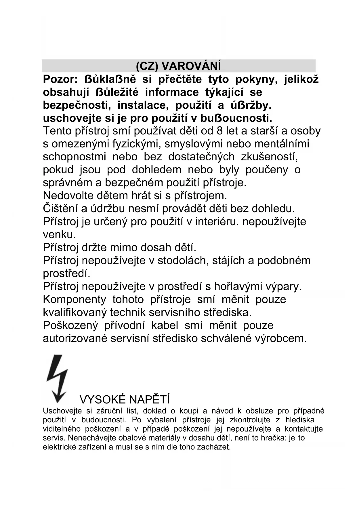 Uschovejte si záruční list, doklad o koupi a návod k obsluze pro případné použití v budoucnosti. Po vybalení přístroje jej zkontrolujte z hlediska viditelného poškození a v případě poškození jej nepoužívejte a kontaktujte servis. Nenechávejte obalové materiály v dosahu dětí, není to hračka: je to elektrické zařízení a musí se s ním dle toho zacházet.Před připojením přístroje se ujistěte, zda napětí v elektrické síti odpovídá napětí na výrobním štítku. Nepoužívejte adaptéry ani prodlužovací kabely, které nevyhovují bezpečnostním standardům, nebo které překračují bezpečnostní limity. Pokud přístroj nepoužíváte, odpojte jej od elektrické sítě a ujistěte se, zda je vypnutý. Při odpojování přístroje netahejte za kabel. Použití elektrických přístrojů vyžaduje dodržování určitých pravidel, zejména: nedotýkejte se přístroje mokrýma nebo vlhkýma rukama; nepoužívejte přístroj, pokud máte bosé nohy; nevystavujte přístroj povětrnostním vlivům (déšť, slunce); nevystavujte jej otřesům. V případě nestandardního provozu přístroje ihned odpojte zástrčku od elektrické sítě, nedotýkejte se přístroje a kontaktujte kvalifikovaného servisního technika. Pokud již přístroj nebudete používat, učiňte jej nepoužitelným po odpojení od elektrické sítě. Přístroj byl navržen pro použití v domácím prostředí; jakékoliv jiné použití je nesprávné a nebezpečné. Nepoužívejte jej venku. Z bezpečnostních důvodů nesmíte přístroj demontovat. K zajištění bezpečnosti přístroje používejte pouze originální náhradní díly a příslušenství. PŘES OTVORY OCHRANNÉ MŘÍŽKY NEVKLÁDEJTE ŽÁDNÉ KOVOVÉ PŘEDMĚTY. (CZ) Technické informace