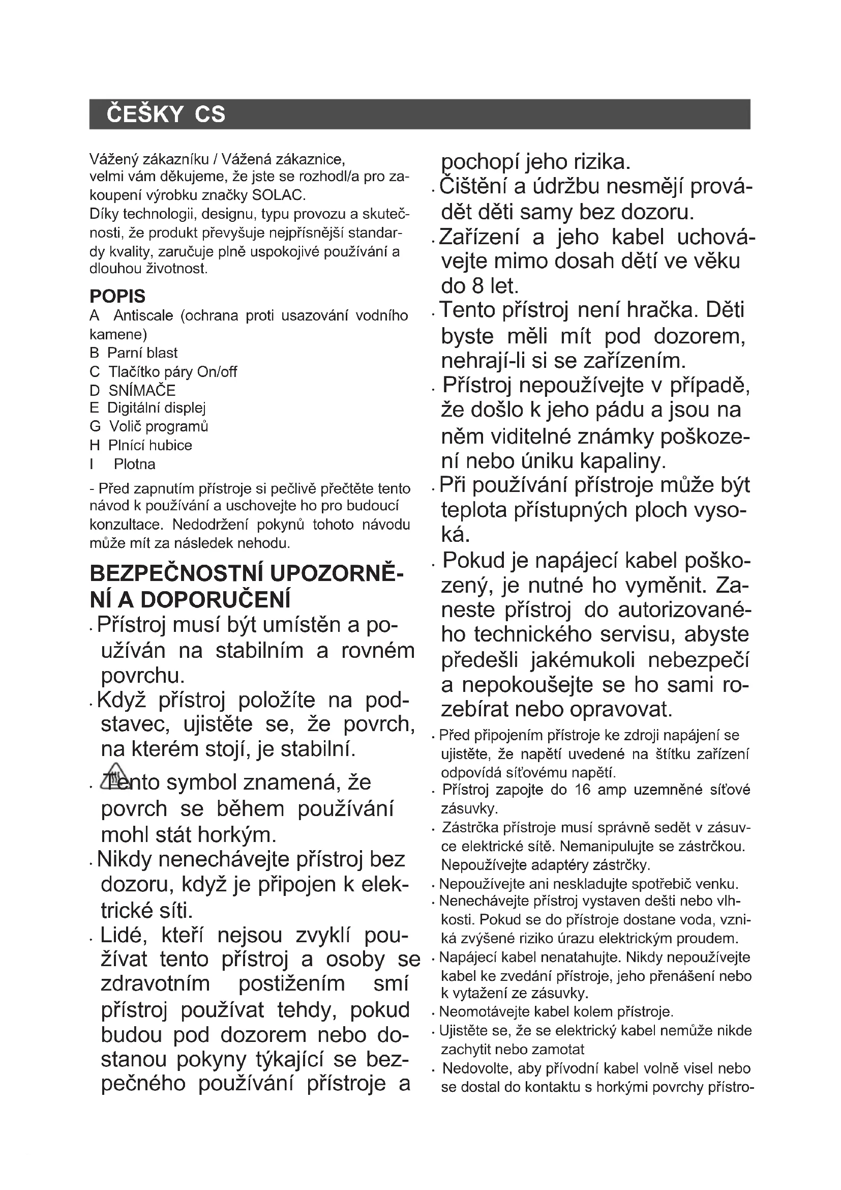 E Digitální displej G Volič programů H Plnící hubice I Plotna - Před zapnutím přístroje si pečlivě přečtěte tento návod k používání a uschovejte ho pro budoucí konzultace. Nedodržení pokynů tohoto návodu může mít za následek nehodu.