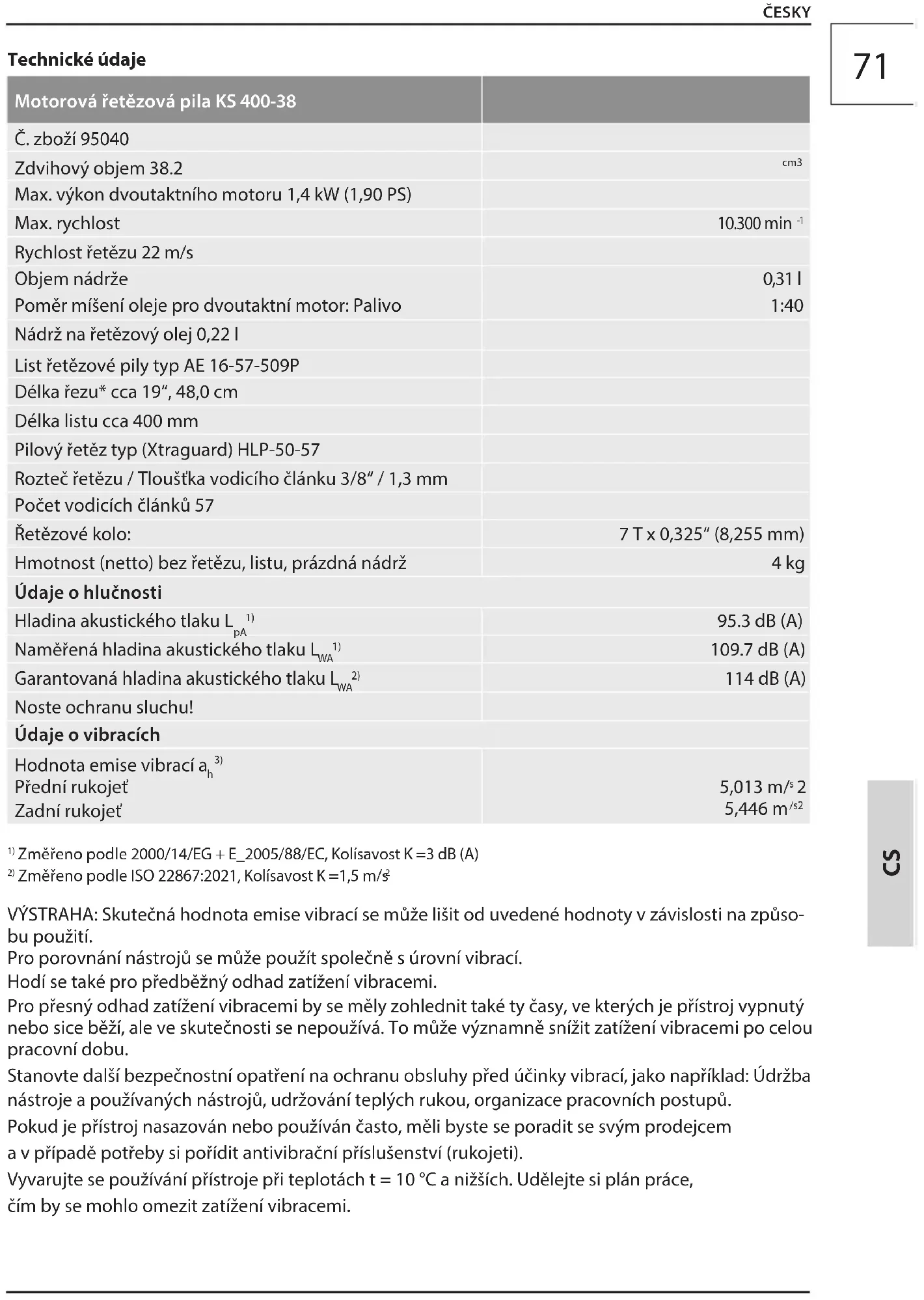 vit/snížit v odborné dílně ČESKY CS80 Technické údaje Motorová reťazová píla KS 400-38 Číslo tovaru 95040 Zdvihový objem valca 38.2 cm3 Max. výkon 2-taktného motora 1,4 kW (1,90 PS) Max. rýchlosť