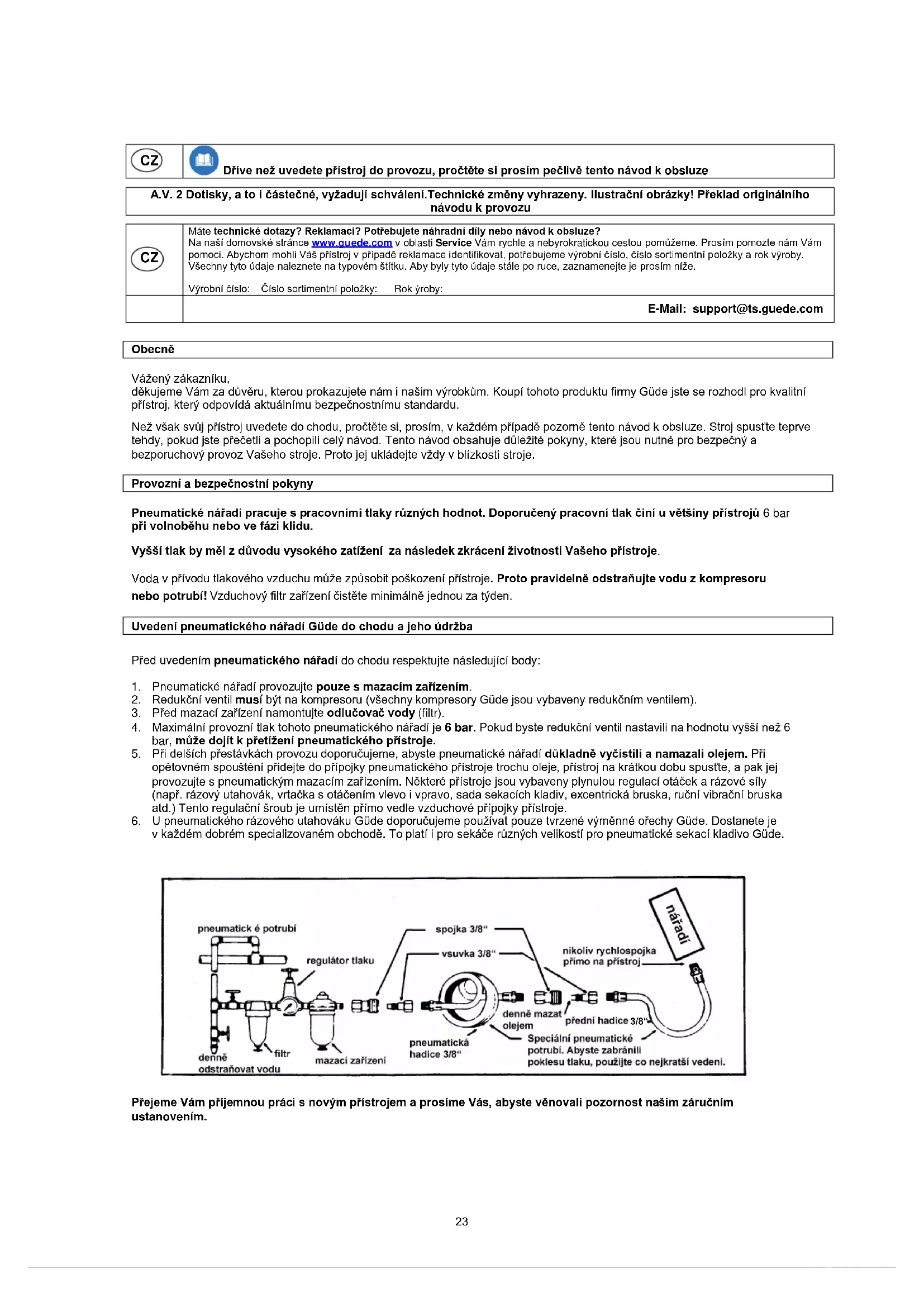 Máte technické dotazy? Reklamaci? Potřebujete náhradní díly nebo návod k obsluze? Na naší domovské stránce www.guede.com v oblasti Service Vám rychle a nebyrokratickou cestou pomůžeme. Prosím pomozte nám Vám pomoci. Abychom mohli Váš přístroj v případě reklamace identifikovat, potřebujeme výrobní číslo, číslo sortimentní položky a rok výroby. Všechny tyto údaje naleznete na typovém štítku. Aby byly tyto údaje stále po ruce, zaznamenejte je prosím níže. Výrobní číslo: Číslo sortimentní položky: Rok ýroby: E-Mail: support@ts.guede.com Obecně Vážený zákazníku, děkujeme Vám za důvěru, kterou prokazujete nám i našim výrobkům. Koupí tohoto produktu firmy Güde jste se rozhodl pro kvalitní přístroj, který odpovídá aktuálnímu bezpečnostnímu standardu. Než však svůj přístroj uvedete do chodu, pročtěte si, prosím, v každém případě pozorně tento návod k obsluze. Stroj spusťte teprve tehdy, pokud jste přečetli a pochopili celý návod. Tento návod obsahuje důležité pokyny, které jsou nutné pro bezpečný a bezporuchový provoz Vašeho stroje. Proto jej ukládejte vždy v blízkosti stroje. Provozní a bezpečnostní pokyny Pneumatické nářadí pracuje s pracovními tlaky různých hodnot. Doporučený pracovní tlak činí u většiny přístrojů 6 bar při volnoběhu nebo ve fázi klidu. Vyšší tlak by měl z důvodu vysokého zatížení za následek zkrácení životnosti Vašeho přístroje. Voda v přívodu tlakového vzduchu může způsobit poškození přístroje. Proto pravidelně odstraňujte vodu z kompresoru nebo potrubí! Vzduchový filtr zařízení čistěte minimálně jednou za týden. Uvedení pneumatického nářadí Güde do chodu a jeho údržba Před uvedením pneumatického nářadí do chodu respektujte následující body: