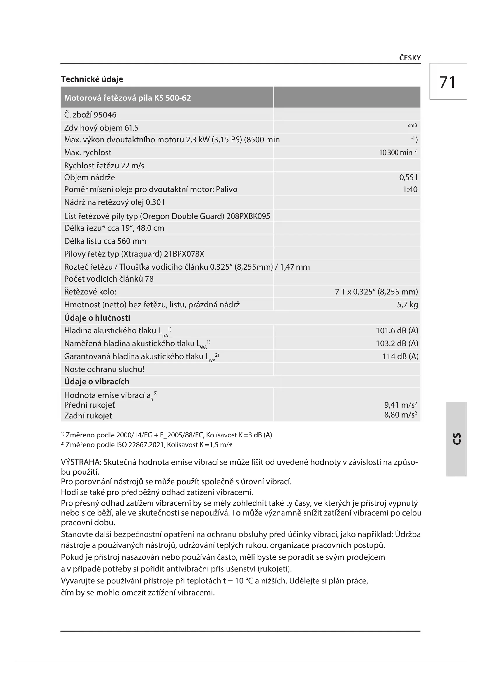 vit/snížit v odborné dílně ČESKY CS80 Technické údaje Motorová reťazová píla KS 500-62 Číslo tovaru 95046 Zdvihový objem valca 61.5 cm3 Max. výkon 2-taktného motora 2,3 kW (3,15 PS) (8500 min