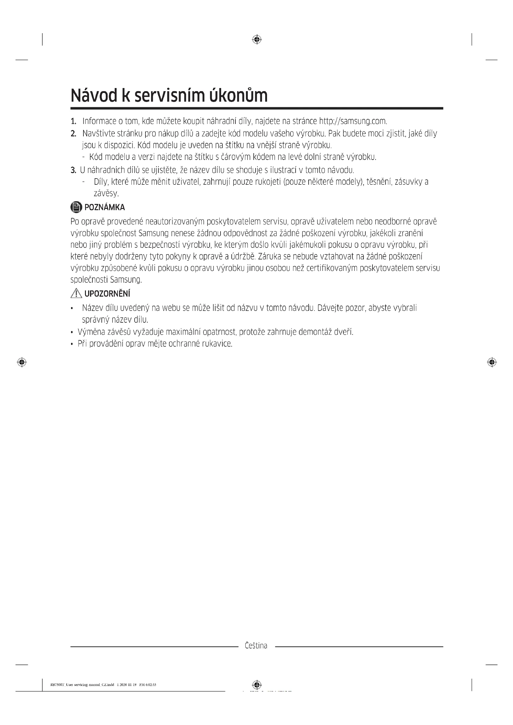 - Díly, které může měnit uživatel, zahrnují pouze rukojeti (pouze některé modely), těsnění, zásuvky a závěsy. POZNÁMKA Po opravě provedené neautorizovaným poskytovatelem servisu, opravě uživatelem nebo neodborné opravě výrobku společnost Samsung nenese žádnou odpovědnost za žádné poškození výrobku, jakékoli zranění nebo jiný problém s bezpečností výrobku, ke kterým došlo kvůli jakémukoli pokusu o opravu výrobku, při které nebyly dodrženy tyto pokyny k opravě a údržbě. Záruka se nebude vztahovat na žádné poškození výrobku způsobené kvůli pokusu o opravu výrobku jinou osobou než certikovaným poskytovatelem servisu společnosti Samsung. UPOZORNĚNÍ