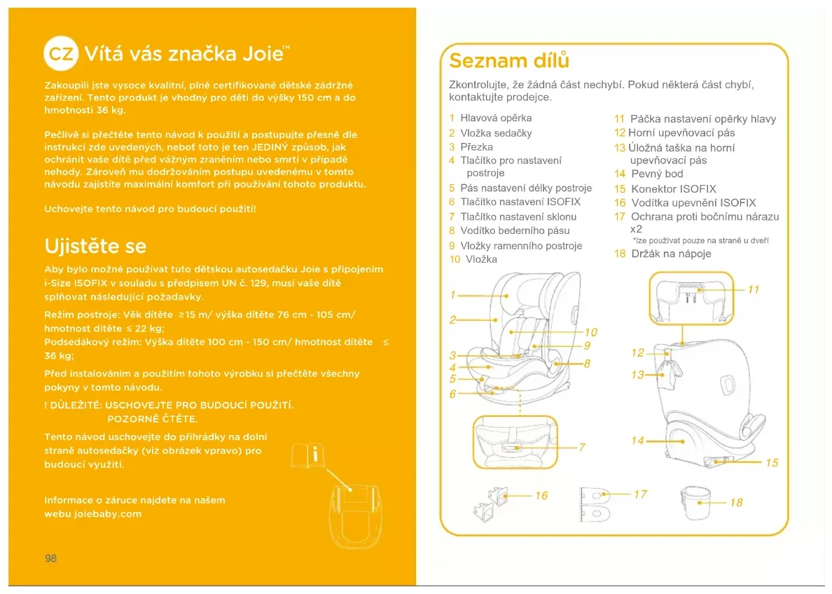 Zakoupili jste vysoce kvalitní﹐ plně certifikované dětské zádržné zařízení. Tento produkt je vhodný pro děti do výšky 150 cm a do hmotnosti 36 kg.Pečlivě si přečtěte tento návod k použití a postupujte přesně dle instrukcí zde uvedených﹐ neboť toto je ten JEDINÝ způsob﹐ jak ochránit vaše dítě před vážným zraněním nebo smrtí v případě nehody. Zároveň mu dodržováním postupu uvedenému v tomto návodu zajistíte maximální komfort při používání tohoto produktu.Uchovejte tento návod pro budoucí použití! Ujistěte se Aby bylo možné používat tuto dětskou autosedačku Joie s připojením i-Size ISOFIX v souladu s předpisem UN č. 129﹐ musí vaše dítě splňovat následující požadavky.Režim postroje: Věk dítěte 15 m/ výška dítěte 76 cm - 105 cm/ hmotnost dítěte 22 kg;Podsedákový režim: Výška dítěte 100 cm - 150 cm/ hmotnost dítěte 36 kg;Před instalováním a použitím tohoto výrobku si přečtěte všechny pokyny v tomto návodu.! DŮLEŽITÉ: USCHOVEJTE PRO BUDOUCÍ POUŽITÍ.POZORNĚ ČTĚTE.Tento návod uschovejte do přihrádky na dolní straně autosedačky (viz obrázek vpravo) pro budoucí využití.Informace o záruce najdete na našem webu joiebaby.com Seznam dílů 1 Hlavová opěrka2 Vložka sedačky3 Přezka4 Tlačítko pro nastavení postroje 5 Pás nastavení délky postroje6 Tlačítko nastavení ISOFIX7 Tlačítko nastavení sklonu8 Vodítko bederního pásu9 Vložky ramenního postroje10 Vložka11 Páčka nastavení opěrky hlavy12 Horní upevňovací pás13 Úložná taška na horní upevňovací pás14 Pevný bod15 Konektor ISOFIX16 Vodítka upevnění ISOFIX17 Ochrana proti bočnímu nárazu *lze používat pouze na straně u dveří18 Držák na nápojeZkontrolujte, že žádná část nechybí. Pokud některá část chybí, kontaktujte prodejce.