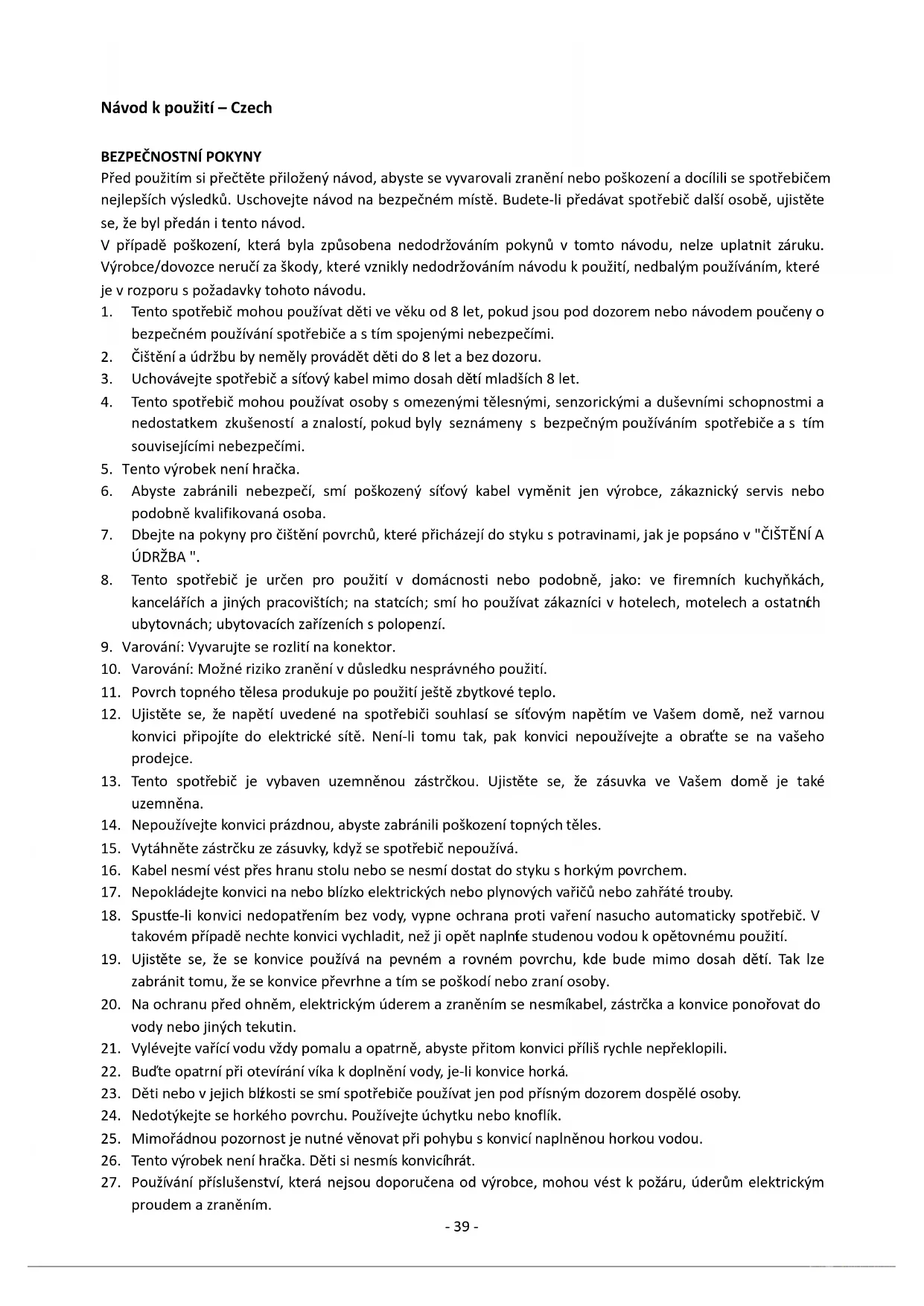 26. Tento výrobek není hračka. Děti si nesmí s konvicí hrát.