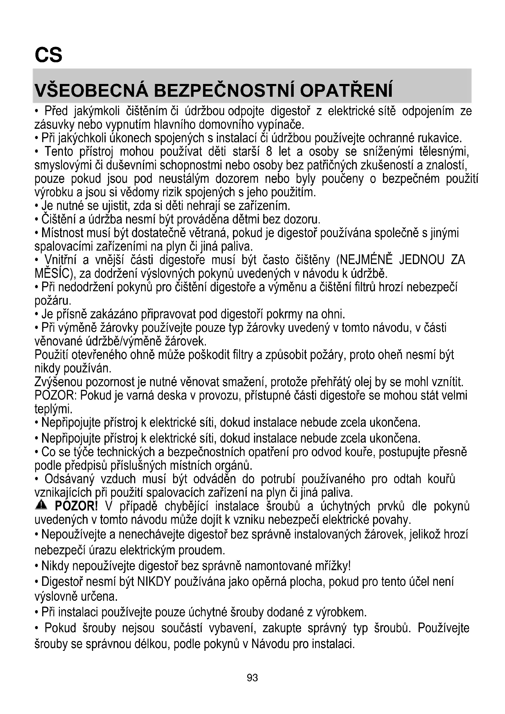 - Odsávaný vzduch musí být odváděn do potrubí používaného pro odtah kouřů vznikajících při použití spalovacích zařízení na plyn či jiná paliva. POZOR! V případě chybějící instalace šroubů a úchytných prvků dle pokynů uvedených v tomto návodu může dojít k vzniku nebezpečí elektrické povahy.