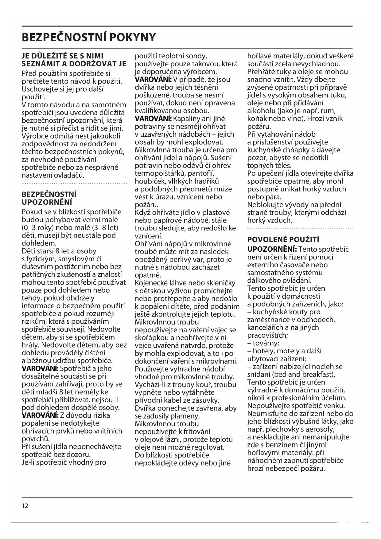 Před použitím spotřebiče si přečtěte tento návod k použití. Uschovejte si jej pro další použití. V tomto návodu a na samotném spotřebiči jsou uvedena důležitá bezpečnostní upozornění, která je nutné si přečíst a řídit se jimi. Výrobce odmítá nést jakoukoli zodpovědnost za nedodržení těchto bezpečnostních pokynů, za nevhodné používání spotřebiče nebo za nesprávné nastavení ovladačů. BEZPEČNOSTNÍ UPOZORNĚNÍ Pokud se v blízkosti spotřebiče budou pohybovat velmi malé (0–3 roky) nebo malé (3–8 let) děti, musejí být neustále pod dohledem. Děti starší 8 let a osoby s fyzickým, smyslovým či duševním postižením nebo bez patřičných zkušeností a znalostí mohou tento spotřebič používat pouze pod dohledem nebo tehdy, pokud obdržely informace o bezpečném použití spotřebiče a pokud rozumějí rizikům, která s používáním spotřebiče souvisejí. Nedovolte dětem, aby si se spotřebičem hrály. Nedovolte dětem, aby bez dohledu prováděly čištění a běžnou údržbu spotřebiče. VAROVÁNÍ: Spotřebič a jeho dosažitelné součásti se při používání zahřívají, proto by se děti mladší 8 let neměly ke spotřebiči přibližovat, nejsou-li pod dohledem dospělé osoby. VAROVÁNÍ: Z důvodu rizika popálení se nedotýkejte ohřívacích prvků nebo vnitřních povrchů. Při sušení jídla neponechávejte spotřebič bez dozoru. Je-li spotřebič vhodný pro použití teplotní sondy, používejte pouze takovou, která je doporučena výrobcem. VAROVÁNÍ: V případě, že jsou dvířka nebo jejich těsnění poškozené, trouba se nesmí používat, dokud není opravena kvalifikovanou osobou. VAROVÁNÍ: Kapaliny ani jiné potraviny se nesmějí ohřívat v uzavřených nádobách – jejich obsah by mohl explodovat. Mikrovlnná trouba je určena pro ohřívání jídel a nápojů. Sušení potravin nebo oděvů či ohřev termopolštářků, pantoflí, houbiček, vlhkých hadříků a podobných předmětů může vést k úrazu, vznícení nebo požáru. Když ohříváte jídlo v plastové nebo papírové nádobě, stále troubu sledujte, aby nedošlo ke vznícení. Ohřívání nápojů v mikrovlnné troubě může mít za následek opožděný perlivý var, proto je nutné s nádobou zacházet opatrně. Kojenecké láhve nebo skleničky s dětskou výživou promíchejte nebo protřepejte a aby nedošlo k popálení dítěte, před podáním ještě zkontrolujte jejich teplotu. Mikrovlnnou troubu nepoužívejte na vaření vajec se skořápkou a neohřívejte v ní vejce uvařená natvrdo, protože by mohla explodovat, a to i po dokončení vaření s mikrovlnami. Používejte výhradně nádobí vhodné pro mikrovlnné trouby. Vychází-li z trouby kouř, troubu vypněte nebo vytáhněte přívodní kabel ze zásuvky. Dvířka ponechejte zavřená, aby se zadusily plameny. Mikrovlnnou troubu nepoužívejte k fritování v olejové lázni, protože teplotu oleje není možné regulovat. Do blízkosti spotřebiče nepokládejte oděvy nebo jiné hořlavé materiály, dokud veškeré součásti zcela nevychladnou. Přehřáté tuky a oleje se mohou snadno vznítit. Vždy dbejte zvýšené opatrnosti při přípravě jídel s vysokým obsahem tuku, oleje nebo při přidávání alkoholu (jako je např. rum, koňak nebo víno). Hrozí vznik požáru. Při vytahování nádob a příslušenství používejte kuchyňské chňapky a dávejte pozor, abyste se nedotkli topných těles. Po upečení jídla otevírejte dvířka spotřebiče opatrně, aby mohl postupně unikat horký vzduch nebo pára. Neblokujte vývody na přední straně trouby, kterými odchází horký vzduch.