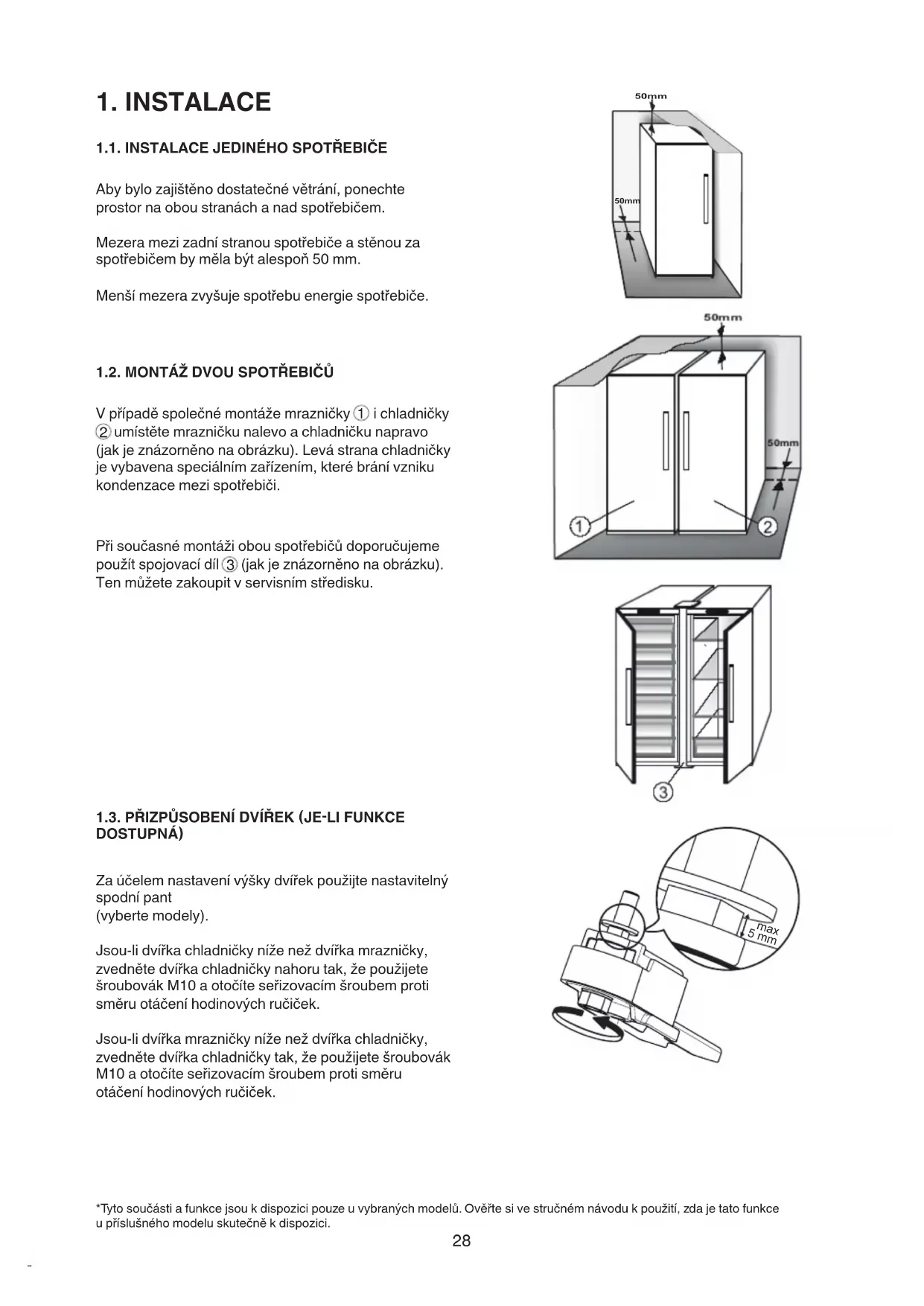 (jakjeznázorněnonaobrázku). Tenmůžetezakoupitvservisnímstředisku. 1.3. PŘIZPŮSOBENÍ DVÍŘEK (JE-LI FUNKCE DOSTUPNÁ) Zaúčelemnastavenívýškydvířekpoužijtenastavitelný spodnípant (vybertemodely). Jsou-lidvířkachladničkyníženeždvířkamrazničky, zvednětedvířkachladničkynahorutak,žepoužijete šroubovákM10aotočíteseřizovacímšroubemproti směruotáčeníhodinovýchručiček. Jsou-lidvířkamrazničkyníženeždvířkachladničky, zvednětedvířkachladničkytak,žepoužijetešroubovák M10aotočíteseřizovacímšroubemprotisměru otáčeníhodinovýchručiček. *Tytosoučástiafunkcejsoukdispozicipouzeuvybranýchmodelů.Ověřtesivestručnémnávodukpoužití,zdajetatofunkce upříslušnéhomodeluskutečněkdispozici. 50mm 50mm 5 mm max29