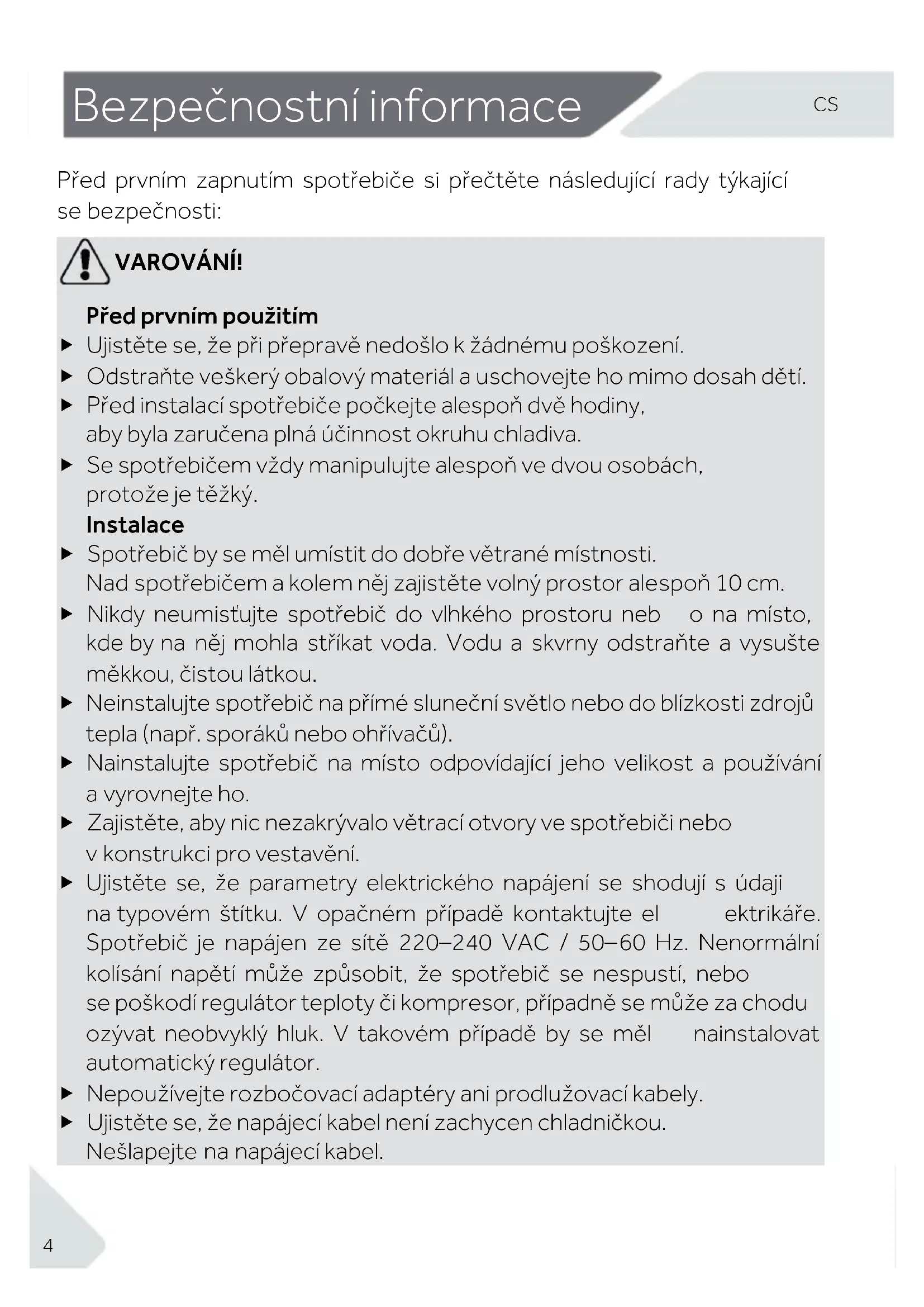 Bezpečnostní i nformace Před prvním zapnutím spotřebiče si přečtěte následující rady týkající se bezpečnosti: