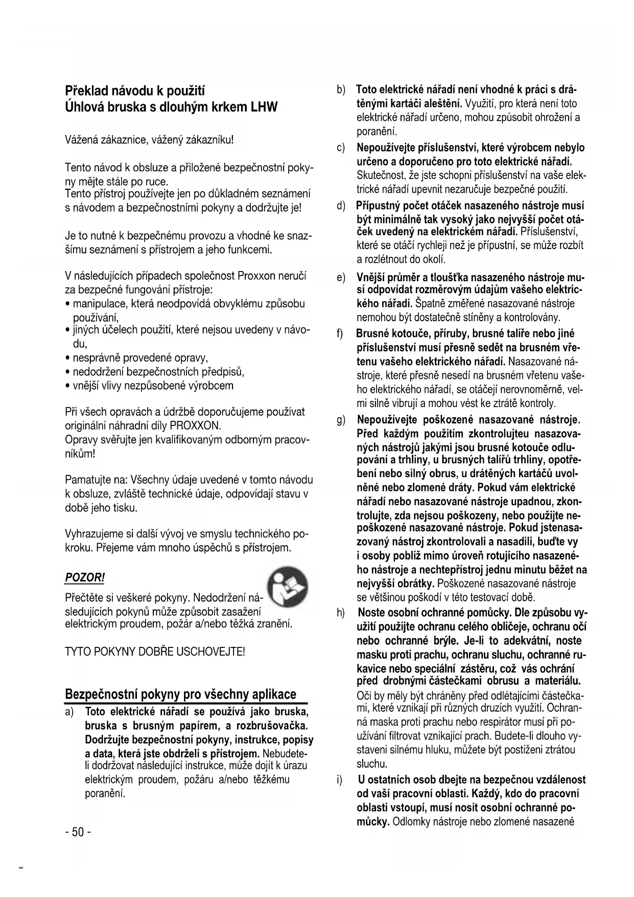 - vnější vlivy nezpůsobené výrobcem Při všech opravách a údržbě doporučujeme používat originální náhradní díly PROXXON. Opravy svěřujte jen kvalifikovaným odborným pracov- níkům! Pamatujte na: Všechny údaje uvedené v tomto návodu k obsluze, zvláště technické údaje, odpovídají stavu v době jeho tisku. Vyhrazujeme si další vývoj ve smyslu technického po- kroku. Přejeme vám mnoho úspěchů s přístrojem. POZOR! Přečtěte si veškeré pokyny. Nedodržení ná- sledujících pokynů může způsobit zasažení elektrickým proudem, požár a/nebo těžká zranění. TYTO POKYNY DOBŘE USCHOVEJTE! Bezpečnostní pokyny pro všechny aplikace a) Toto elektrické nářadí se používá jako bruska, bruska s brusným papírem, a rozbrušovačka. Dodržujte bezpečnostní pokyny, instrukce, popisy a data, která jste obdrželi s přístrojem. Nebudete- li dodržovat následující instrukce, může dojít k úrazu elektrickým proudem, požáru a/nebo těžkému poranění. b) Toto elektrické nářadí není vhodné k práci s drá- těnými kartáči aleštění. Využití, pro která není toto elektrické nářadí určeno, mohou způsobit ohrožení a poranění.