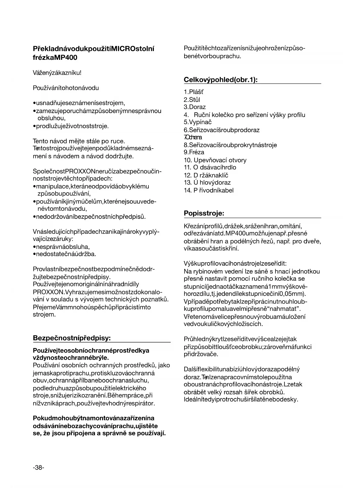 - prodlužuje životnost stroje. Te nto návod mějte stále po ruce. Te nto stroj používejte jen po důkladném sezná- mení s návodem a návod dodržujte. Společnost PROXXON neručí za bezpečnou čin- nost stroje v těchto případech: