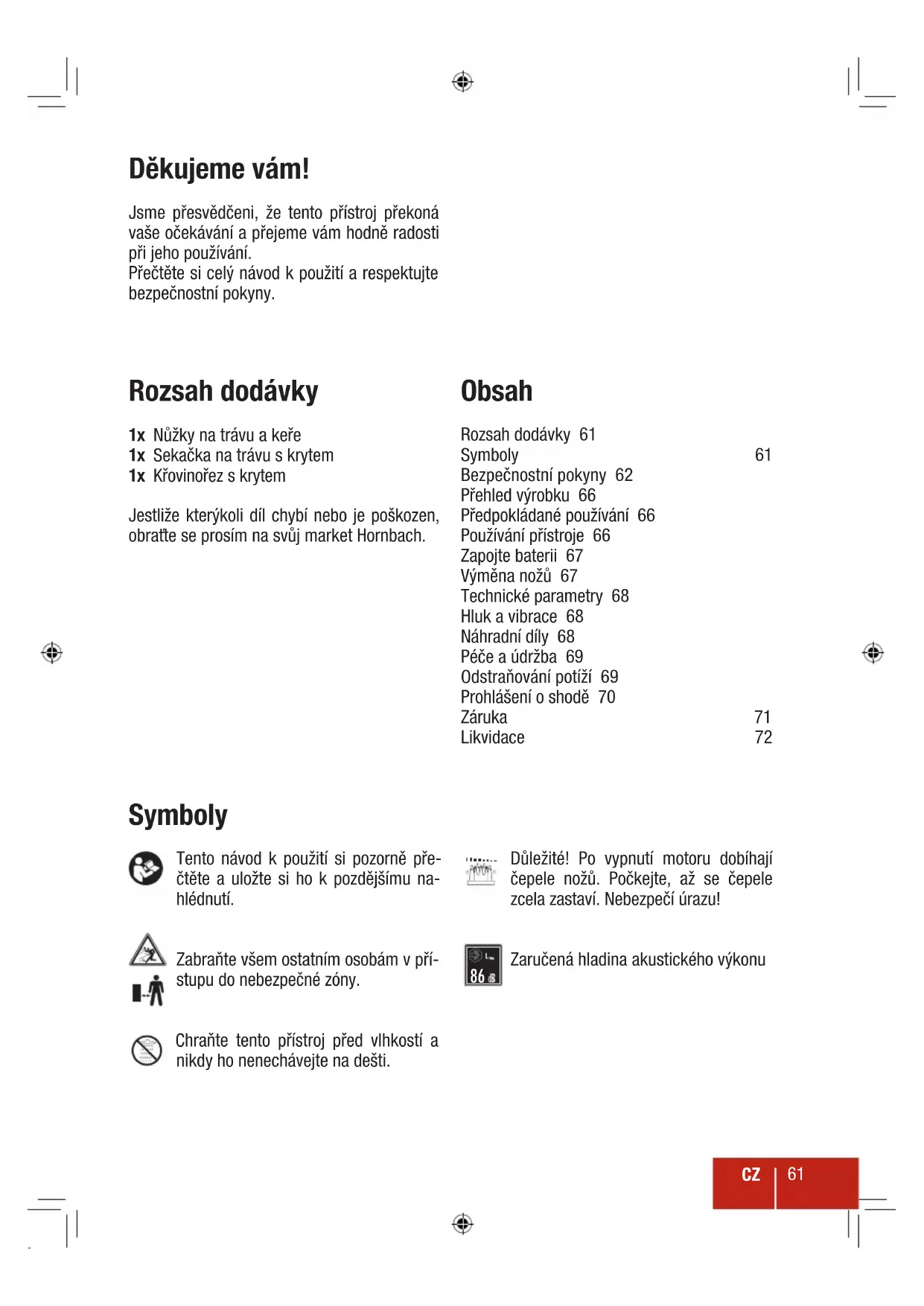 Děkujeme vám! Jsme přesvědčeni, že tento přístroj překoná vaše očekávání a přejeme vám hodně radosti při jeho používání. Přečtěte si celý návod k použití a respektujte bezpečnostní pokyny. Rozsah dodávky 1x Nůžky na trávu a keře 1x Sekačka na trávu s krytem 1x Křovinořez s krytem Jestliže kterýkoli díl chybí nebo je poškozen, obraťte se prosím na svůj market Hornbach. Obsah Rozsah dodávky 61 Symboly 61 Bezpečnostní pokyny 62 Přehled výrobku 66 Předpokládané používání 66 Používání přístroje 66 Zapojte baterii 67 Výměna nožů 67 Technické parametry 68 Hluk a vibrace 68 Náhradní díly 68 Péče a údržba 69 Odstraňování potíží 69 Prohlášení o shodě 70 Záruka 71 Likvidace 72 Symboly Tento návod k použití si pozorně pře- čtěte a uložte si ho k pozdějšímu na- hlédnutí. Zabraňte všem ostatním osobám v pří- stupu do nebezpečné zóny.