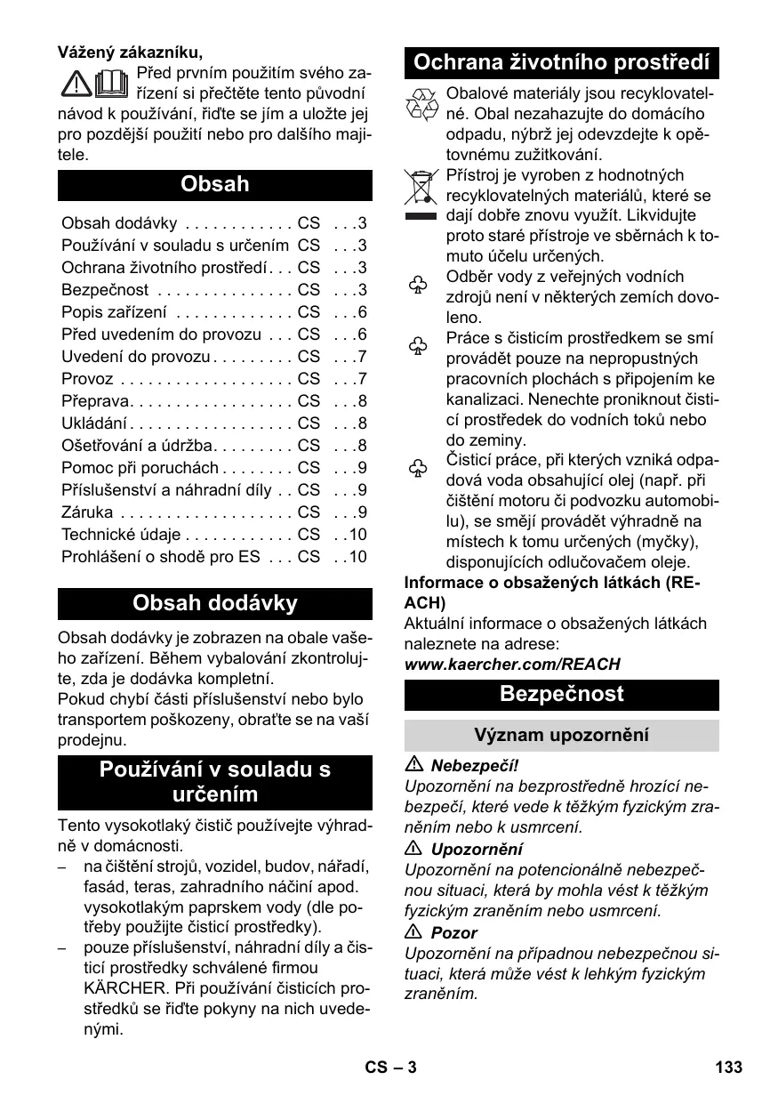 Obsah dodávky Obsah dodávky je zobrazen na obale vašeho zařízení. Během vybalování zkontrolujte, zda je dodávka kompletní. Pokud chybí části příslušenství nebo bylo transportem poškozeny, obraťte se na vaší prodejnu. Ochrana životního prostředí Obalové materiály jsou recyklovatelné. Obal nezahazujte do domácího odpadu, nýbrž jej odevzdejte k opětovnému zužitkování. Přístroj je vyroben z hodnotných recyklovatelných materiálů, které se dají dobře znovu využít. Likvidujte proto staré přístroje ve sběrnách k tomuto účelu určených. Odběr vody z veřejných vodních zdrojů není v některých zemích dovoleno. Práce s čisticím prostředkem se smí provádět pouze na nepropustných pracovních plochách s připojením ke kanalizaci. Nenechte proniknout čisticí prostředek do vodních toků nebo do zeminy. Čisticí práce, při kterých vzniká odpadová voda obsahující olej (např. při čištění motoru či podvozku automobilu), se smějí provádět výhradně na místech k tomu určených (myčky), disponujících odlučovačem oleje. Informace o obsažených látkách (REACH) Aktuální informace o obsažených látkách naleznete na adrese: www.kaercher.com/REACH Bezpečnost Význam upozornění Nebezpečí! Používání v souladu s určením Tento vysokotlaký čistič používejte výhradně v domácnosti. – na čištění strojů, vozidel, budov, nářadí, fasád, teras, zahradního náčiní apod. vysokotlakým paprskem vody (dle potřeby použijte čisticí prostředky). – pouze příslušenství, náhradní díly a čisticí prostředky schválené firmou KÄRCHER. Při používání čisticích prostředků se řiďte pokyny na nich uvedenými. Upozornění na bezprostředně hrozící nebezpečí, které vede k těžkým fyzickým zraněním nebo k usmrcení. 몇 Upozornění Upozornění na potencionálně nebezpečnou situaci, která by mohla vést k těžkým fyzickým zraněním nebo usmrcení. 몇 Pozor Upozornění na případnou nebezpečnou situaci, která může vést k lehkým fyzickým zraněním. CS – 3