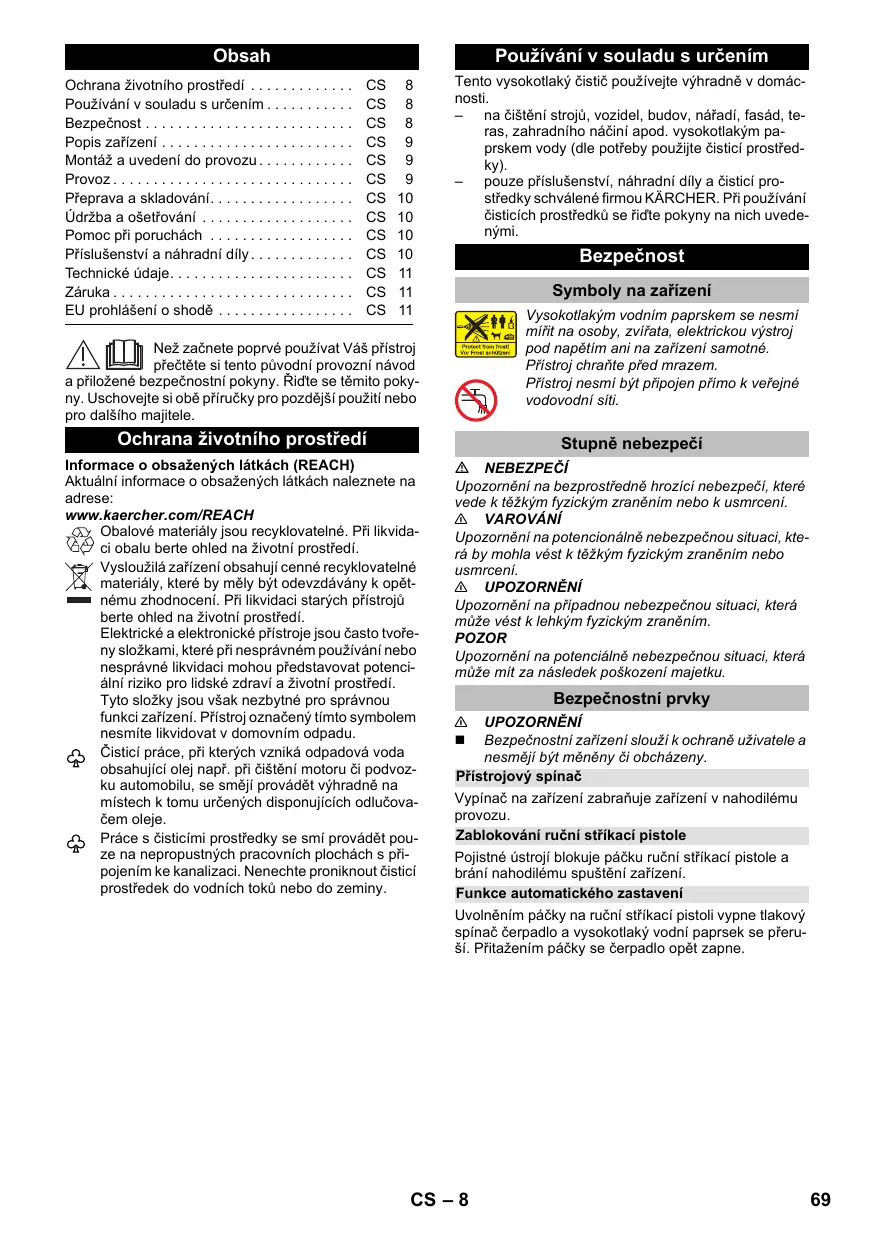 Tento vysokotlaký čistič používejte výhradně v domácnosti. – na čištění strojů, vozidel, budov, nářadí, fasád, teras, zahradního náčiní apod. vysokotlakým paprskem vody (dle potřeby použijte čisticí prostředky). – pouze příslušenství, náhradní díly a čisticí prostředky schválené firmou KÄRCHER. Při používání čisticích prostředků se řiďte pokyny na nich uvedenými. Bezpečnost Symboly na zařízení Vysokotlakým vodním paprskem se nesmí mířit na osoby, zvířata, elektrickou výstroj pod napětím ani na zařízení samotné. Přístroj chraňte před mrazem. Přístroj nesmí být připojen přímo k veřejné vodovodní síti. Než začnete poprvé používat Váš přístroj přečtěte si tento původní provozní návod a přiložené bezpečnostní pokyny. Řiďte se těmito pokyny. Uschovejte si obě příručky pro pozdější použití nebo pro dalšího majitele. Ochrana životního prostředí Stupně nebezpečí Informace o obsažených látkách (REACH) Aktuální informace o obsažených látkách naleznete na adrese: www.kaercher.com/REACH Obalové materiály jsou recyklovatelné. Při likvidaci obalu berte ohled na životní prostředí. Vysloužilá zařízení obsahují cenné recyklovatelné materiály, které by měly být odevzdávány k opětnému zhodnocení. Při likvidaci starých přístrojů berte ohled na životní prostředí. Elektrické a elektronické přístroje jsou často tvořeny složkami, které při nesprávném používání nebo nesprávné likvidaci mohou představovat potenciální riziko pro lidské zdraví a životní prostředí. Tyto složky jsou však nezbytné pro správnou funkci zařízení. Přístroj označený tímto symbolem nesmíte likvidovat v domovním odpadu. Čisticí práce, při kterých vzniká odpadová voda obsahující olej např. při čištění motoru či podvozku automobilu, se smějí provádět výhradně na místech k tomu určených disponujících odlučovačem oleje. Práce s čisticími prostředky se smí provádět pouze na nepropustných pracovních plochách s připojením ke kanalizaci. Nenechte proniknout čisticí prostředek do vodních toků nebo do zeminy. NEBEZPEČÍ Upozornění na bezprostředně hrozící nebezpečí, které vede k těžkým fyzickým zraněním nebo k usmrcení. 몇 VAROVÁNÍ Upozornění na potencionálně nebezpečnou situaci, která by mohla vést k těžkým fyzickým zraněním nebo usmrcení. 몇 UPOZORNĚNÍ Upozornění na případnou nebezpečnou situaci, která může vést k lehkým fyzickým zraněním. POZOR Upozornění na potenciálně nebezpečnou situaci, která může mít za následek poškození majetku. Bezpečnostní prvky