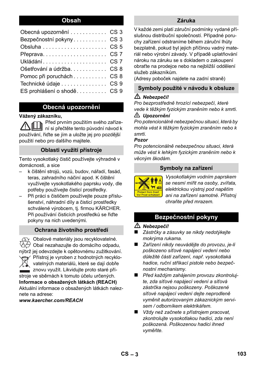 Obecná upozornění Vážený zákazníku, Před prvním použitím svého zařízení si přečtěte tento původní návod k používání, řiďte se jím a uložte jej pro pozdější použití nebo pro dalšího majitele. Oblasti využití přístroje Tento vysokotlaký čistič používejte výhradně v domácnosti, a sice – k čištění strojů, vozů, budov, nářadí, fasád, teras, zahradního náčiní apod. K čištění využívejte vysokotlakého paprsku vody, dle potřeby používejte čisticí prostředky. – Při práci s čističem používejte pouze příslušenství, náhradní díly a čisticí prostředky schválené výrobcem, tj. firmou KÄRCHER. Při používání čisticích prostředků se řiďte pokyny na nich uvedenými. Ochrana životního prostředí V každé zemi platí záruční podmínky vydané příslušnou distribuční společností. Případné poruchy zařízení odstraníme během záruční lhůty bezplatně, pokud byl jejich příčinou vadný materiál nebo výrobní závady. V případě uplatňování nároku na záruku se s dokladem o zakoupení obraťte na prodejce nebo na nejbližší oddělení služeb zákazníkům. (Adresy poboček najdete na zadní straně) Symboly použité v návodu k obsluze Nebezpečí! Pro bezprostředně hrozící nebezpečí, které vede k těžkým fyzickým zraněním nebo k smrti. 몇 Upozornění Pro potencionálně nebezpečnou situaci, která by mohla vést k těžkým fyzickým zraněním nebo k smrti. Pozor Pro potencionálně nebezpečnou situaci, která může vést k lehkým fyzickým zraněním nebo k věcným škodám. Symboly na zařízení Vysokotlakým vodním paprskem se nesmí mířit na osoby, zvířata, elektrickou výstroj pod napětím ani na zařízení samotné. Přístroj chraňte před mrazem. Bezpečnostní pokyny Nebezpečí! Zástrčky a zásuvky se nikdy nedotýkejte Obalové materiály jsou recyklovatelné. Obal nezahazujte do domácího odpadu, nýbrž jej odevzdejte k opětovnému zužitkování. Přístroj je vyroben z hodnotných recyklovatelných materiálů, které se dají dobře znovu využít. Likvidujte proto staré přístroje ve sběrnách k tomuto účelu určených. Informace o obsažených látkách (REACH) Aktuální informace o obsažených látkách naleznete na adrese: www.kaercher.com/REACH mokrýma rukama. Zařízení nikdy neuvádějte do provozu, je-li poškozeno síťové napájecí vedení nebo důležité části zařízení, např. vysokotlaká hadice, ruční stříkací pistole nebo bezpečnostní mechanismy. Před každým zahájením provozu zkontrolujte, zda síťové napájecí vedení a síťová zástrčka nejsou poškozeny. Poškozené síťové napájecí vedení dejte neprodleně vyměnit autorizovaným zákaznickým servisem / odborníkem elektrikářem. Vždy než začnete s přístrojem pracovat, zkontrolujte vysokotlakou hadici, zda není poškozená. Poškozenou hadici ihned vyměňte. CS – 3