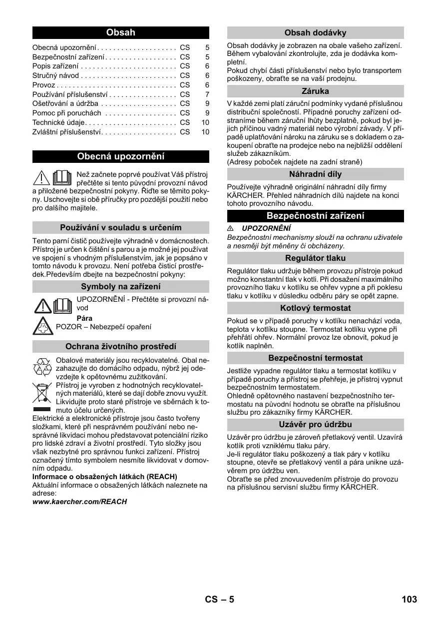 Obecná upozornění Než začnete poprvé používat Váš přístroj přečtěte si tento původní provozní návod a přiložené bezpečnostní pokyny. Řiďte se těmito pokyny. Uschovejte si obě příručky pro pozdější použití nebo pro dalšího majitele. Používání v souladu s určením Tento parní čistič používejte výhradně v domácnostech. Přístroj je určen k čištění s parou a je možné jej používat ve spojení s vhodným příslušenstvím, jak je popsáno v tomto návodu k provozu. Není potřeba čisticí prostředek.Především dbejte na bezpečnostní pokyny: Symboly na zařízení UPOZORNĚNÍ - Přečtěte si provozní návod Pára POZOR – Nebezpečí opaření Ochrana životního prostředí Obalové materiály jsou recyklovatelné. Obal nezahazujte do domácího odpadu, nýbrž jej odevzdejte k opětovnému zužitkování. Přístroj je vyroben z hodnotných recyklovatelných materiálů, které se dají dobře znovu využít. Likvidujte proto staré přístroje ve sběrnách k tomuto účelu určených. Elektrické a elektronické přístroje jsou často tvořeny složkami, které při nesprávném používání nebo nesprávné likvidaci mohou představovat potenciální riziko pro lidské zdraví a životní prostředí. Tyto složky jsou však nezbytné pro správnou funkci zařízení. Přístroj označený tímto symbolem nesmíte likvidovat v domovním odpadu. Informace o obsažených látkách (REACH) Aktuální informace o obsažených látkách naleznete na adrese: www.kaercher.com/REACH Obsah dodávky je zobrazen na obale vašeho zařízení. Během vybalování zkontrolujte, zda je dodávka kompletní. Pokud chybí části příslušenství nebo bylo transportem poškozeny, obraťte se na vaší prodejnu. Záruka V každé zemi platí záruční podmínky vydané příslušnou distribuční společností. Případné poruchy zařízení odstraníme během záruční lhůty bezplatně, pokud byl jejich příčinou vadný materiál nebo výrobní závady. V případě uplatňování nároku na záruku se s dokladem o zakoupení obraťte na prodejce nebo na nejbližší oddělení služeb zákazníkům. (Adresy poboček najdete na zadní straně) Náhradní díly Používejte výhradně originální náhradní díly firmy KÄRCHER. Přehled náhradních dílů najdete na konci tohoto provozního návodu. Bezpečnostní zařízení 몇 UPOZORNĚNÍ Bezpečnostní mechanismy slouží na ochranu uživatele a nesmějí být měněny či obcházeny. Regulátor tlaku Regulátor tlaku udržuje během provozu přístroje pokud možno konstantní tlak v kotli. Při dosažení maximálního provozního tlaku v kotlíku se ohřev vypne a při poklesu tlaku v kotlíku v důsledku odběru páry se opět zapne. Kotlový termostat Pokud se v případě poruchy v kotlíku nenachází voda, teplota v kotlíku stoupne. Termostat kotlíku vypne při přehřátí ohřev. Normální provoz lze obnovit, pokud je kotlík naplněn. Bezpečnostní termostat Jestliže vypadne regulátor tlaku a termostat kotlíku v případě poruchy a přístroj se přehřeje, je přístroj vypnut bezpečnostním termostatem. Ohledně opětovného nastavení bezpečnostního termostatu na původní hodnotu se obraťte na příslušnou službu pro zákazníky firmy KÄRCHER. Uzávěr pro údržbu Uzávěr pro údržbu je zároveň přetlakový ventil. Uzavírá kotlík proti vzniklému tlaku páry. Je-li regulátor tlaku poškozený a tlak páry v kotlíku stoupne, otevře se přetlakový ventil a pára unikne uzávěrem pro údržbu ven. Obraťte se před znovuuvedením přístroje do provozu na příslušnou servisní službu firmy KÄRCHER. CS – 5