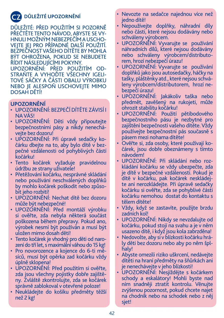 DŮLEŽITÉ: PŘED POUŽITÍM SI POZORNĚ PŘEČTĚTE TENTO NÁVOD, ABYSTE SE VYHNULI MOŽNÝM NEBEZPEČÍM A USCHOVEJTE JEJ PRO PŘÍPADNÉ DALŠÍ POUŽITÍ. BEZPEČNOST VAŠEHO DÍTĚTE BY MOHLA BÝT OHROŽENA, POKUD SE NEBUDETE ŘÍDIT NÁSLEDUJÍCÍMI POKYNY. UPOZORNĚNÍ: PŘED POUŽITÍM ODSTRAŇTE A VYHOĎTE VŠECHNY IGELITOVÉ SÁČKY A ČÁSTI OBALU VÝROBKU NEBO JE ALESPOŇ USCHOVEJTE MIMO DOSAH DĚTÍ! UPOZORNĚNÍ • UPOZORNĚNÍ: BEZPEČÍ DÍTĚTE ZÁVISÍ I NA VÁS! • UPOZORNĚNÍ: Děti vždy připoutejte bezpečnostními pásy a nikdy nenechávejte bez dozoru! • UPOZORNĚNÍ: Při úpravě sedačky kočárku dbejte na to, aby bylo dítě v bezpečné vzdálenosti od pohyblivých částí kočárku! • Tento kočárek vyžaduje pravidelnou údržbu ze strany uživatele! • Přetěžování kočárku, nesprávné skládání nebo používání neschválených doplňků by mohlo kočárek poškodit nebo způsobit jeho rozbití! • UPOZORNĚNÍ: Nechat dítě bez dozoru může být nebezpečné! • UPOZORNĚNÍ: Před montáží výrobku si ověřte, zda nebyla některá součást poškozena během přepravy. Pokud ano, výrobek nesmí být používán a musí být uložen mimo dosah dětí! • Tento kočárek je vhodný pro děti od narození do tří let, s maximální váhou do 15 kg! • Pro novorozence a kojence do 6-ti měsíců, musí být opěrka zad kočárku vždy úplně sklopena! • UPOZORNĚNÍ: Před použitím si ověřte, zda jsou všechny pojistky dobře zajištěny. Zvláště zkontrolujte, zda se kočárek správně zablokoval v otevřené poloze! • Neukládejte do košíku předměty těžší než 2 kg! 42