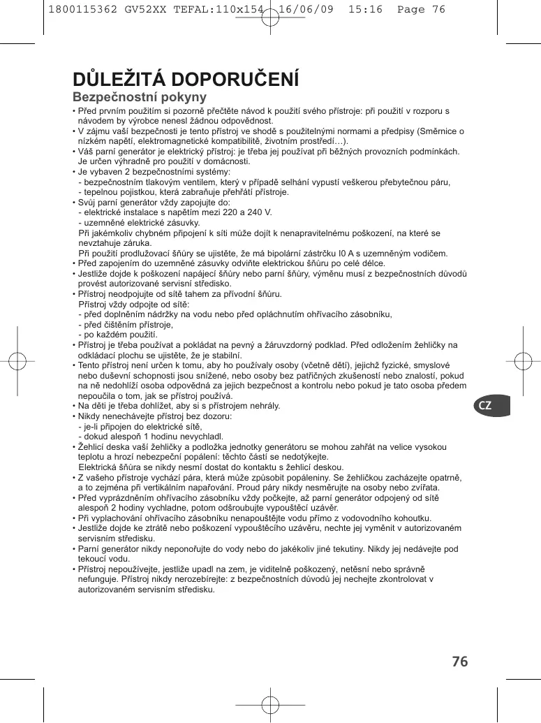 D Bezpečnostní pokyny • Před prvním použitím si pozorně přečtěte návod k použití svého přístroje: při použití v rozporu s návodem by výrobce nenesl žádnou odpovědnost. • V zájmu vaší bezpečnosti je tento přístroj ve shodě s použitelnými normami a předpisy (Směrnice o nízkém napětí, elektromagnetické kompatibilitě, životním prostředí…). • Váš parní generátor je elektrický přístroj: je třeba jej používat při běžných provozních podmínkách. Je určen výhradně pro použití v domácnosti. • Je vybaven 2 bezpečnostními systémy: - bezpečnostním tlakovým ventilem, který v případě selhání vypustí veškerou přebytečnou páru, - tepelnou pojistkou, která zabraňuje přehřátí přístroje. • Svůj parní generátor vždy zapojujte do: - elektrické instalace s napětím mezi 220 a 240 V. - uzemněné elektrické zásuvky. Při jakémkoliv chybném připojení k síti může dojít k nenapravitelnému poškození, na které se nevztahuje záruka. Při použití prodlužovací šňůry se ujistěte, že má bipolární zástrčku I0 A s uzemněným vodičem. • Před zapojením do uzemněné zásuvky odviňte elektrickou šňůru po celé délce. • Jestliže dojde k poškození napájecí šňůry nebo parní šňůry, výměnu musí z bezpečnostních důvodů provést autorizované servisní středisko. • Přístroj neodpojujte od sítě tahem za přívodní šňůru. Přístroj vždy odpojte od sítě: - před doplněním nádržky na vodu nebo před opláchnutím ohřívacího zásobníku, - před čištěním přístroje, - po každém použití. • Přístroj je třeba používat a pokládat na pevný a žáruvzdorný podklad. Před odložením žehličky na odkládací plochu se ujistěte, že je stabilní. • Tento přístroj není určen k tomu, aby ho používaly osoby (včetně dětí), jejichž fyzické, smyslové nebo duševní schopnosti jsou snížené, nebo osoby bez patřičných zkušeností nebo znalostí, pokud na ně nedohlíží osoba odpovědná za jejich bezpečnost a kontrolu nebo pokud je tato osoba předem nepoučila o tom, jak se přístroj používá. • Na děti je třeba dohlížet, aby si s přístrojem nehrály. • Nikdy nenechávejte přístroj bez dozoru: - je-li připojen do elektrické sítě, - dokud alespoň 1 hodinu nevychladl. • Žehlicí deska vaší žehličky a podložka jednotky generátoru se mohou zahřát na velice vysokou teplotu a hrozí nebezpeční popálení: těchto částí se nedotýkejte. Elektrická šňůra se nikdy nesmí dostat do kontaktu s žehlicí deskou. • Z vašeho přístroje vychází pára, která může způsobit popáleniny. Se žehličkou zacházejte opatrně, a to zejména při vertikálním napařování. Proud páry nikdy nesměrujte na osoby nebo zvířata. • Před vyprázdněním ohřívacího zásobníku vždy počkejte, až parní generátor odpojený od sítě alespoň 2 hodiny vychladne, potom odšroubujte vypouštěcí uzávěr. • Při vyplachování ohřívacího zásobníku nenapouštějte vodu přímo z vodovodního kohoutku. • Jestliže dojde ke ztrátě nebo poškození vypouštěcího uzávěru, nechte jej vyměnit v autorizovaném servisním středisku. • Parní generátor nikdy neponořujte do vody nebo do jakékoliv jiné tekutiny. Nikdy jej nedávejte pod tekoucí vodu. • Přístroj nepoužívejte, jestliže upadl na zem, je viditelně poškozený, netěsní nebo správně nefunguje. Přístroj nikdy nerozebírejte: z bezpečnostních důvodů jej nechejte zkontrolovat v autorizovaném servisním středisku.