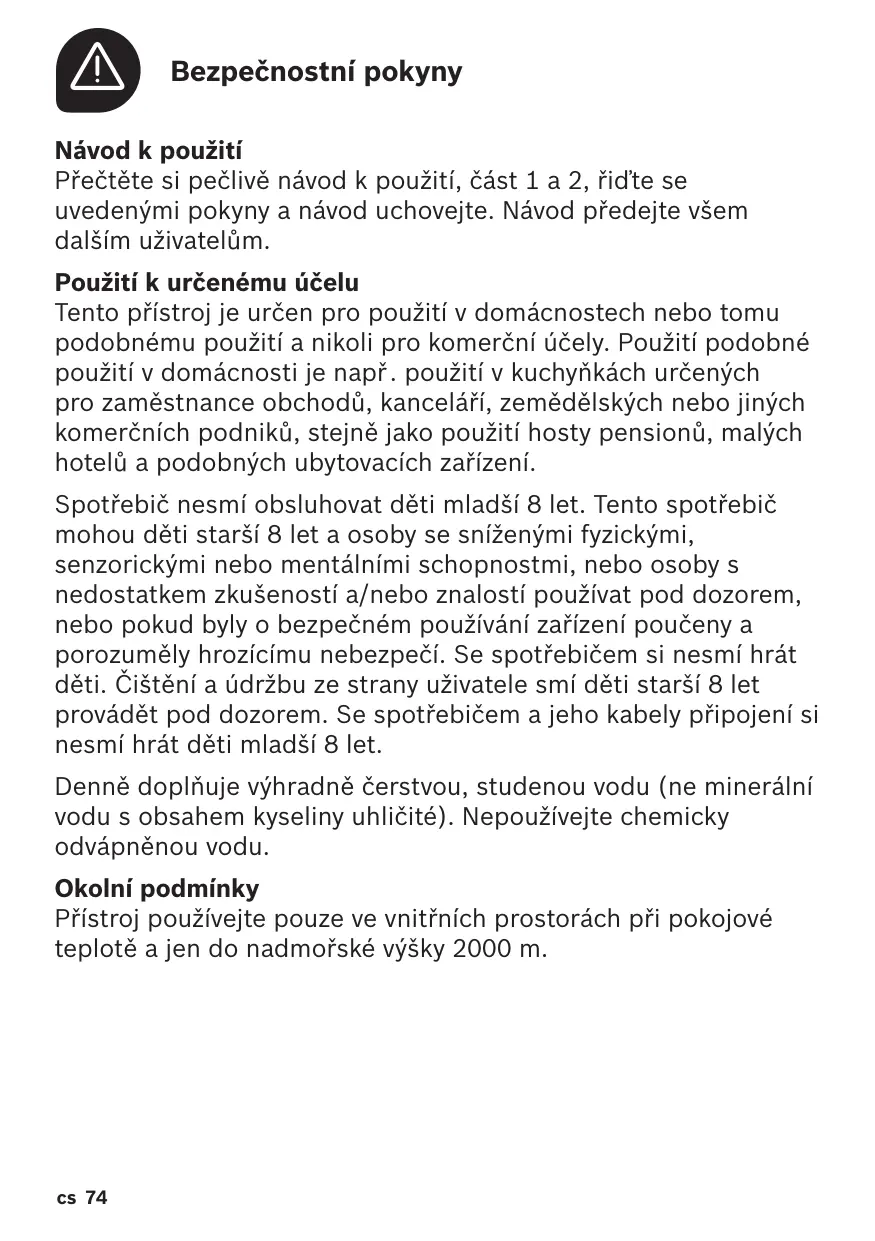 Návod k použití Přečtěte si pečlivě návod k použití, část 1 a 2, řiďte se uvedenými pokyny a návod uchovejte. Návod předejte všem dalším uživatelům. Použití k určenému účelu Tento přístroj je určen pro použití v domácnostech nebo tomu podobnému použití a nikoli pro komerční účely. Použití podobné použití v domácnosti je např . použití v kuchyňkách určených pro zaměstnance obchodů, kanceláří, zemědělských nebo jiných komerčních podniků, stejně jako použití hosty pensionů, malých hotelů a podobných ubytovacích zařízení. Spotřebič nesmí obsluhovat děti mladší 8 let. Tento spotřebič mohou děti starší 8 let a osoby se sníženými fyzickými, senzorickými nebo mentálními schopnostmi, nebo osoby s nedostatkem zkušeností a/nebo znalostí používat pod dozorem, nebo pokud byly o bezpečném používání zařízení poučeny a porozuměly hrozícímu nebezpečí. Se spotřebičem si nesmí hrát děti. Čištění a údržbu ze strany uživatele smí děti starší 8 let provádět pod dozorem. Se spotřebičem a jeho kabely připojení si nesmí hrát děti mladší 8 let. Denně doplňuje výhradně čerstvou, studenou vodu (ne minerální vodu s obsahem kyseliny uhličité). Nepoužívejte chemicky odvápněnou vodu. Okolní podmínky Přístroj používejte pouze ve vnitřních prostorách při pokojové teplotě a jen do nadmořské výšky 2000 m.