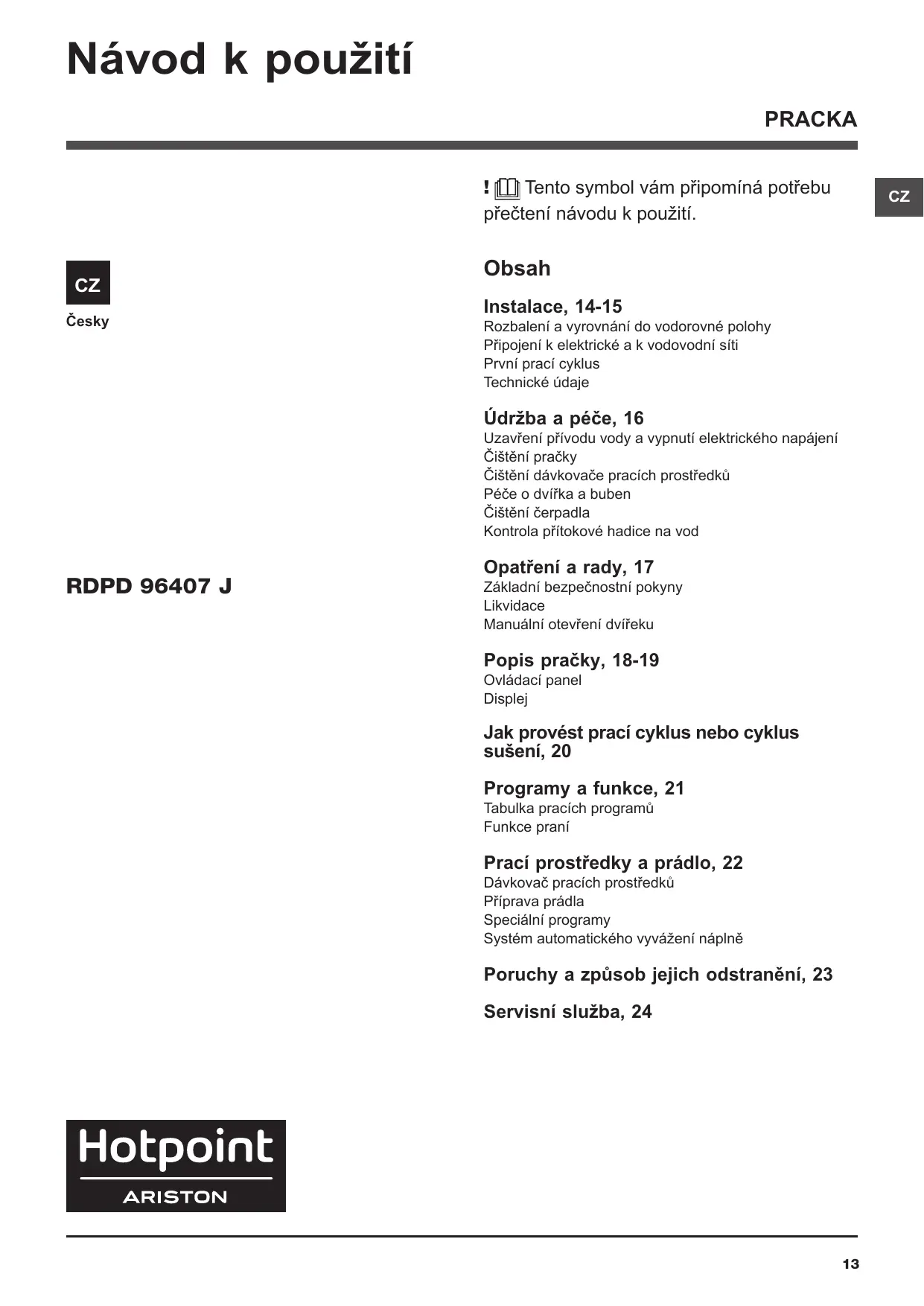 NÁVOD K OBSLUZE RDPD 96407 JD EU.1 HOTPOINT