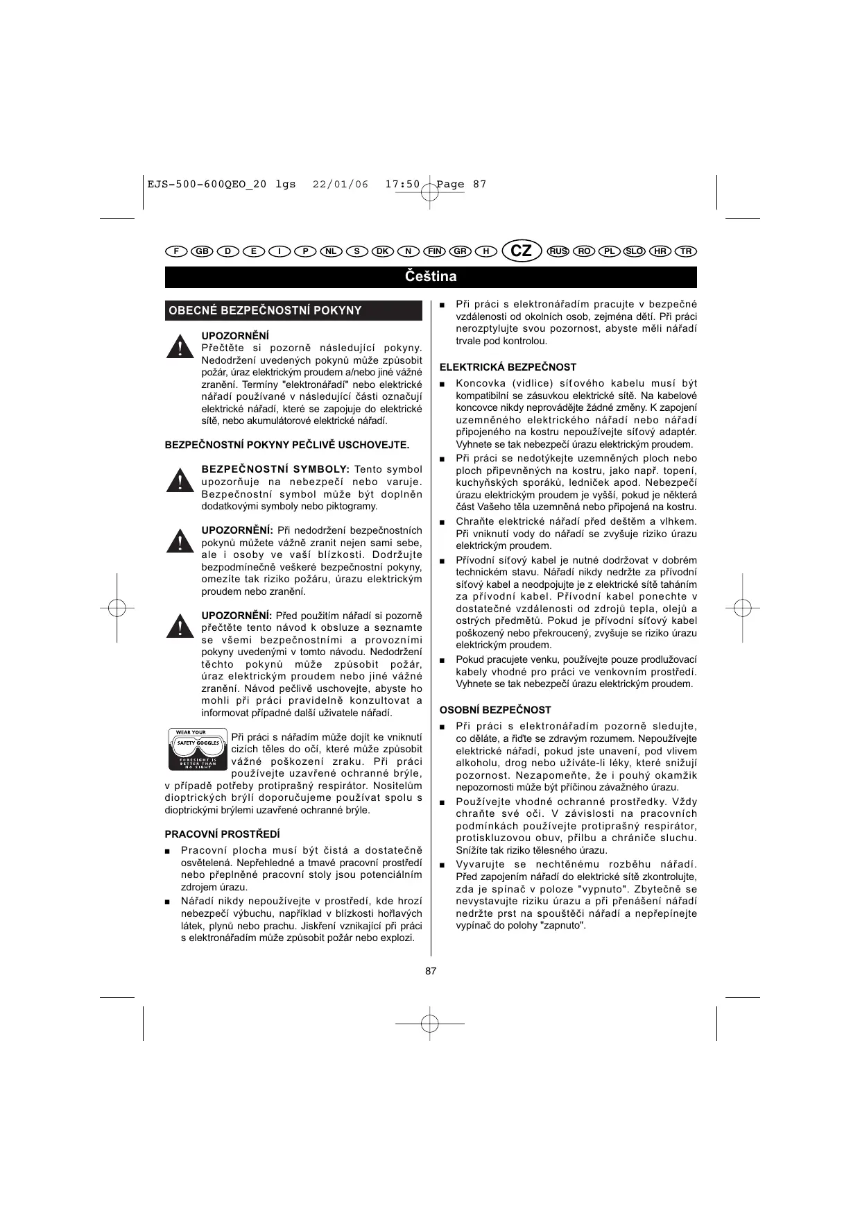 Při práci s elektronářadím pozorně sledujte, co děláte, a řiďte se zdravým rozumem. Nepoužívejte elektrické nářadí, pokud jste unavení, pod vlivem alkoholu, drog nebo užíváte-li léky, které snižují pozornost. Nezapomeňte, že i pouhý okamžik nepozornosti může být příčinou závažného úrazu. Používejte vhodné ochranné prostředky. Vždy chraňte své oči. V závislosti na pracovních podmínkách používejte protiprašný respirátor, protiskluzovou obuv, přilbu a chrániče sluchu. Snížíte tak riziko tělesného úrazu. Vyvarujte se nechtěnému rozběhu nářadí. Před zapojením nářadí do elektrické sítě zkontrolujte, zda je spínač v poloze "vypnuto". Zbytečně se nevystavujte riziku úrazu a při přenášení nářadí nedržte prst na spouštěči nářadí a nepřepínejte vypínač do polohy "zapnuto". 22/01/06 EJS-500-600QEO_20 lgs