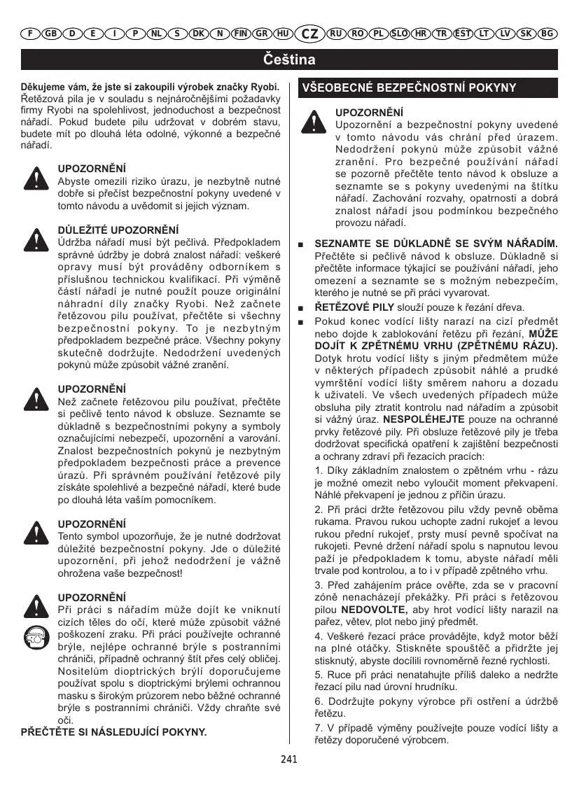 Čeština Děkujeme vám, že jste si zakoupili výrobek značky Ryobi. Řetězová pila je v souladu s nejnáročnějšími požadavky firmy Ryobi na spolehlivost, jednoduchost a bezpečnost nářadí. Pokud budete pilu udržovat v dobrém stavu, budete mít po dlouhá léta odolné, výkonné a bezpečné nářadí.
