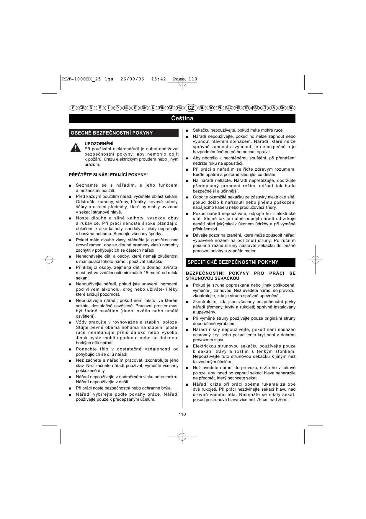 Seznamte se s nářadím, s jeho funkcemi a možnostmi použití. Před každým použitím nářadí vyčistěte oblast sekání. Odstraňte kameny, střepy, hřebíky, kovové kabely, šňůry a ostatní předměty, které by mohly uvíznout v sekací strunové hlavě. Noste dlouhé a silné kalhoty, vysokou obuv a rukavice. Při práci nenoste široké plandající oblečení, krátké kalhoty, sandály a nikdy nepracujte s bosýma nohama. Sundejte všechny šperky. Pokud máte dlouhé vlasy, stáhněte je gumičkou nad úrovní ramen, aby se dlouhé prameny vlasů nemohly zachytit v pohybujících se částech nářadí. Nenechávejte děti a osoby, které nemají zkušenosti s manipulací tohoto nářadí, používat sekačku. Přihlížející osoby, zejména děti a domácí zvířata, musí být ve vzdálenosti minimálně 15 metrů od místa sekání. Nepoužívejte nářadí, pokud jste unavení, nemocní, pod vlivem alkoholu, drog nebo užíváte-li léky, které snižují pozornost. Nepoužívejte nářadí, pokud není místo, ve kterém sekáte, dostatečně osvětlené. Pracovní prostor musí být řádně osvětlen (denní světlo nebo umělé osvětlení). Vždy pracujte v rovnovážné a stabilní poloze. Stůjte pevně oběma nohama na stabilní ploše, ruce nenatahujte příliš daleko nebo vysoko. Jinak byste mohli upadnout nebo se dotknout horkých dílů nářadí. Ponechte tělo v dostatečné vzdálenosti od pohybujících se dílů nářadí. Než začnete s nářadím pracovat, zkontrolujte jeho stav. Než začnete nářadí používat, vyměňte všechny poškozené díly. Nářadí nepoužívejte v nadměrném vlhku nebo mokru. Nářadí nepoužívejte v dešti. Při práci noste bezpečnostní nebo ochranné brýle. Nářadí vybírejte podle povahy práce. Nářadí používejte pouze k předepsaným účelům.